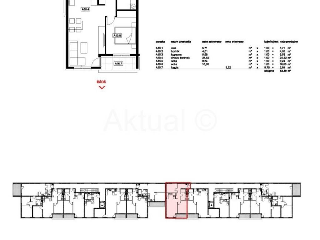 Stan oznake A10 nalazi se na I-katu zgrade, ukupne površine 62.30 m2 a sastoji se od ulaznog prostora/hodnika, kuhinje, blagovaonice i dnevnog boravka, dvije sobe, kupaonice i loggie.