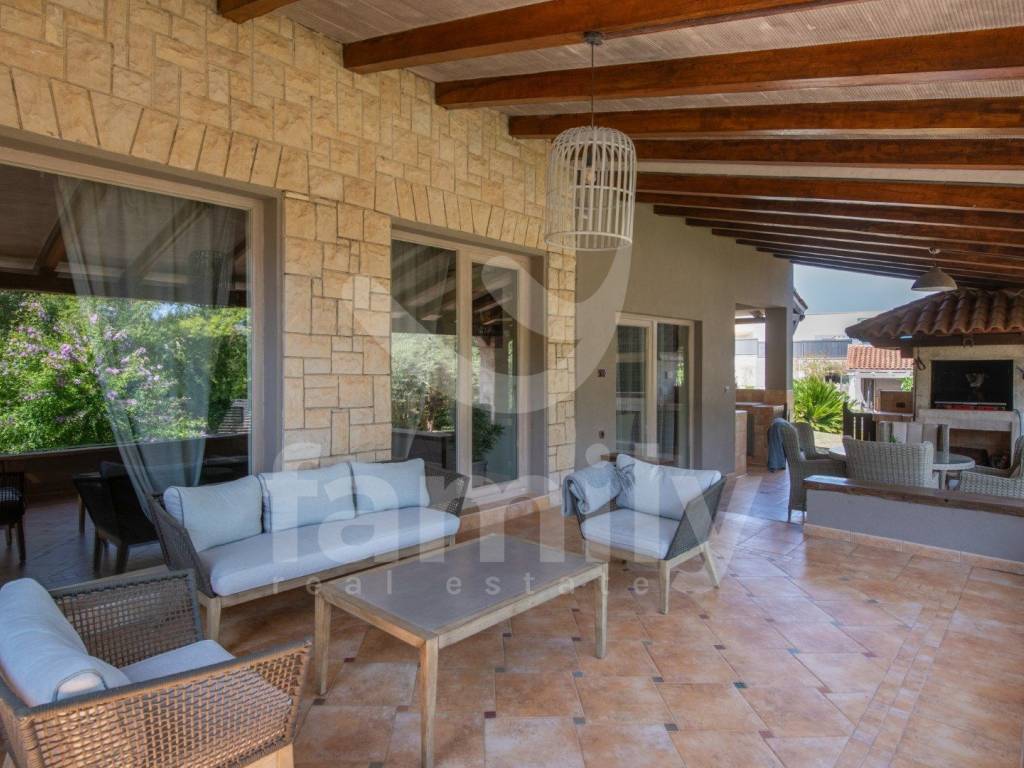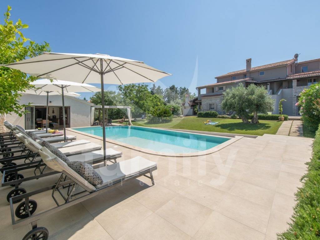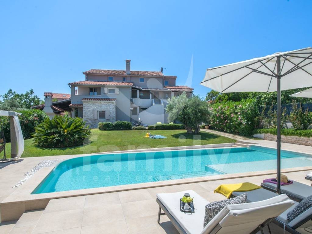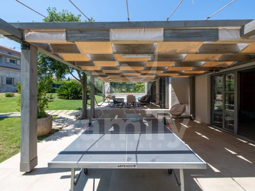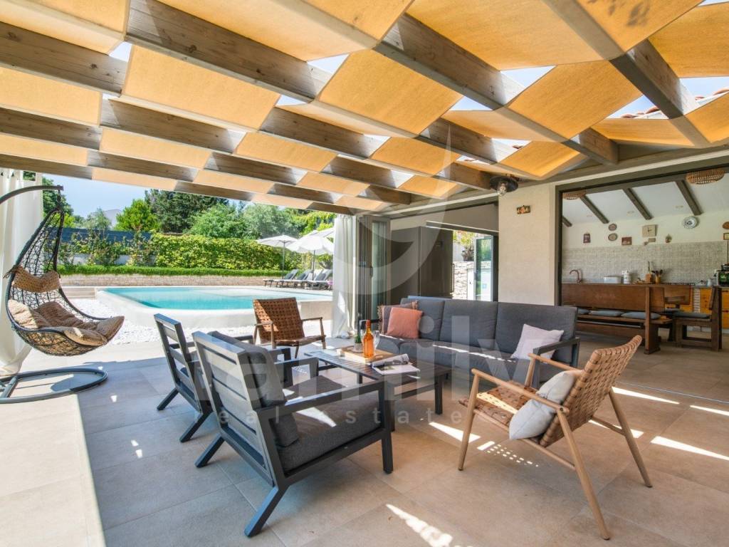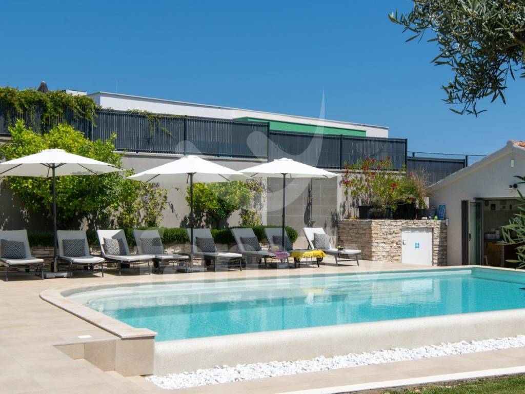 This comfortable villa in Ližnjan of 450 m2 near the sea represents the perfect combination of elegance, functionality and complete privacy. Located in a peaceful environment on a plot of 2368 m2, it provides ideal conditions for relaxation and enjoyment throughout the year. The spacious interior exudes brightness thanks to large glass surfaces that connect the indoor and outdoor spaces. The villa has a modernly decorated ground floor with an open-concept living room with access to a covered terrace, a fully equipped kitchen with a dining room and two comfortable bedrooms with a bathroom that provide maximum comfort. Each room has been carefully designed to provide a sense of spaciousness and warmth of home.
