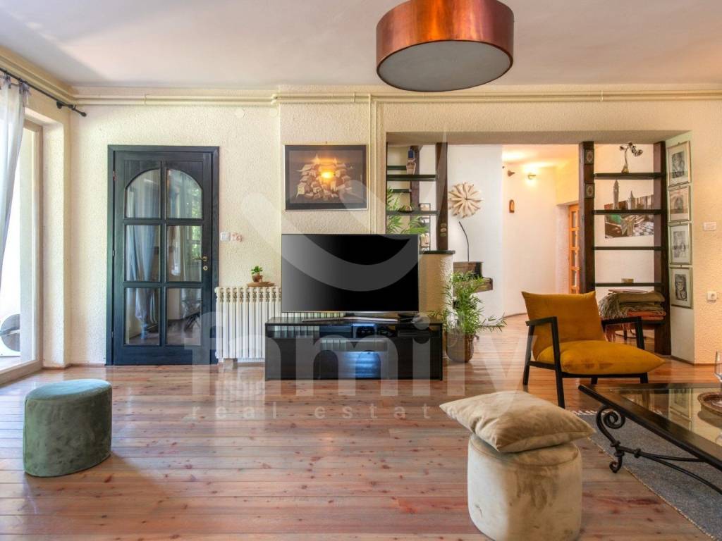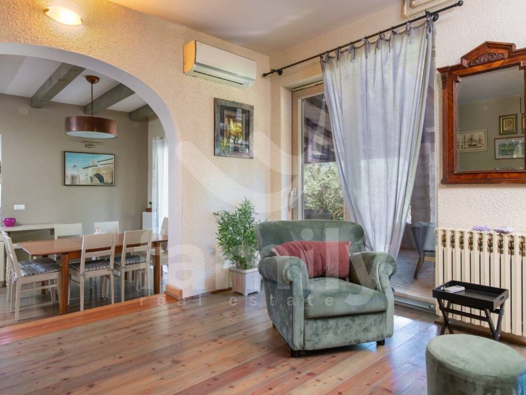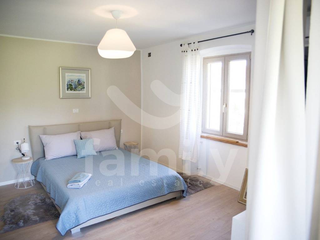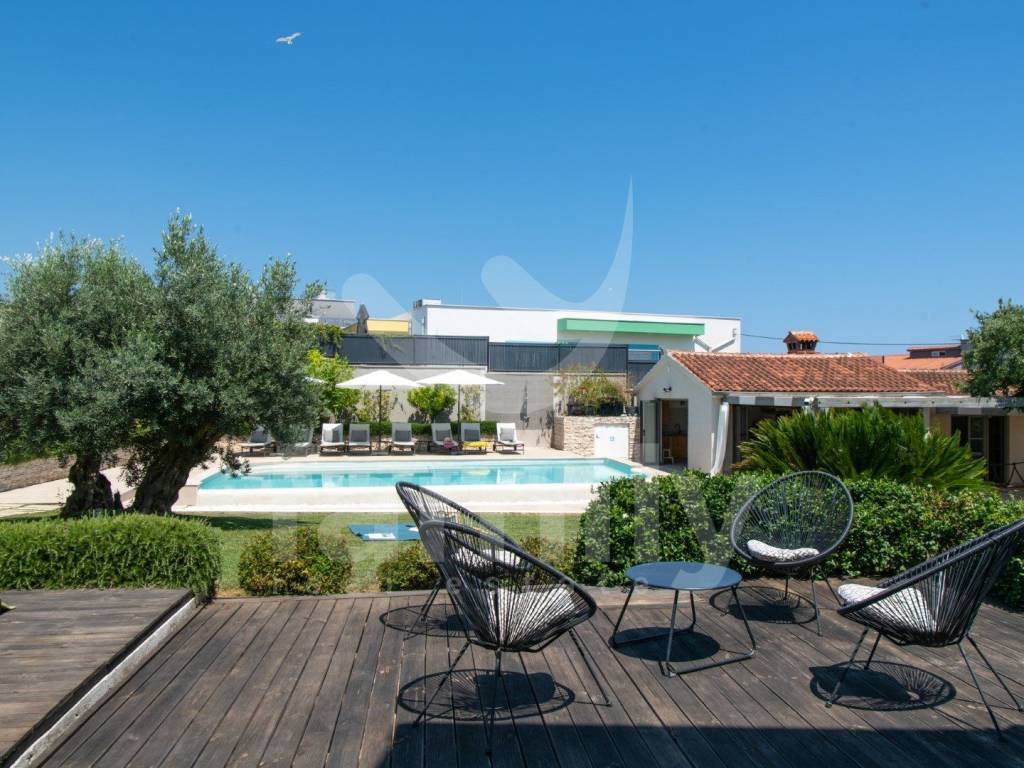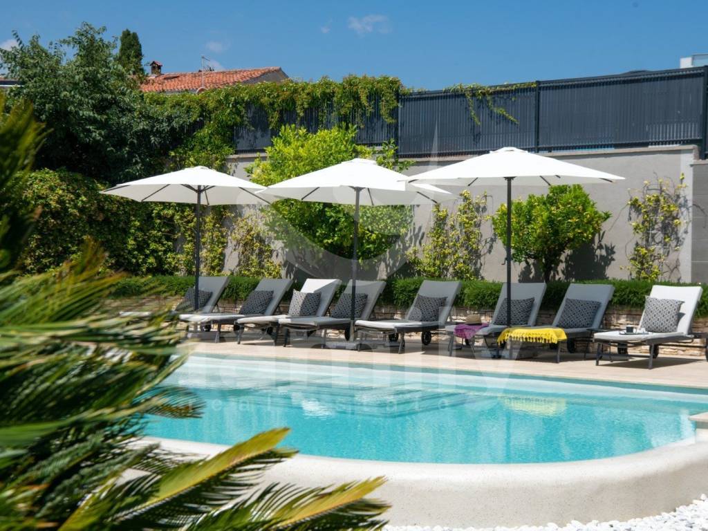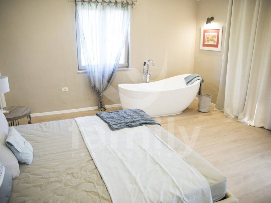 A modernly equipped staircase leads to the first floor of the property where the bedrooms are located, also with bathrooms and access to terraces overlooking the stunning courtyard with a heated pool. The property is equipped with PVC joinery with shutters, the floors in the kitchen and bathrooms are covered with quality ceramics, while the floors in the living room and bedrooms are equipped with larch parquet and laminate, the heating system is regulated by central electric heating with radiators, air conditioning units are installed throughout the property. The third and last floors are also equipped for use, the entire property is sold furnished.