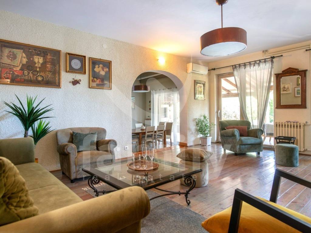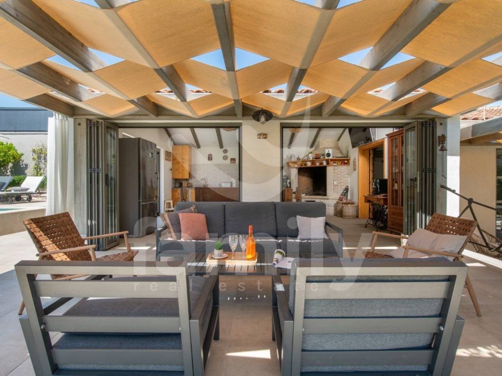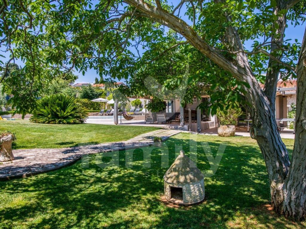 The landscaped garden offers a private swimming pool with a sunbathing area, a covered terrace, a fully equipped tavern with a fireplace measuring 70m2 for socializing and enough space for rest and recreation. The Mediterranean greenery, cared for by irrigation, as a peaceful atmosphere, creates a real oasis of peace, ideal for family life or tourist rental.