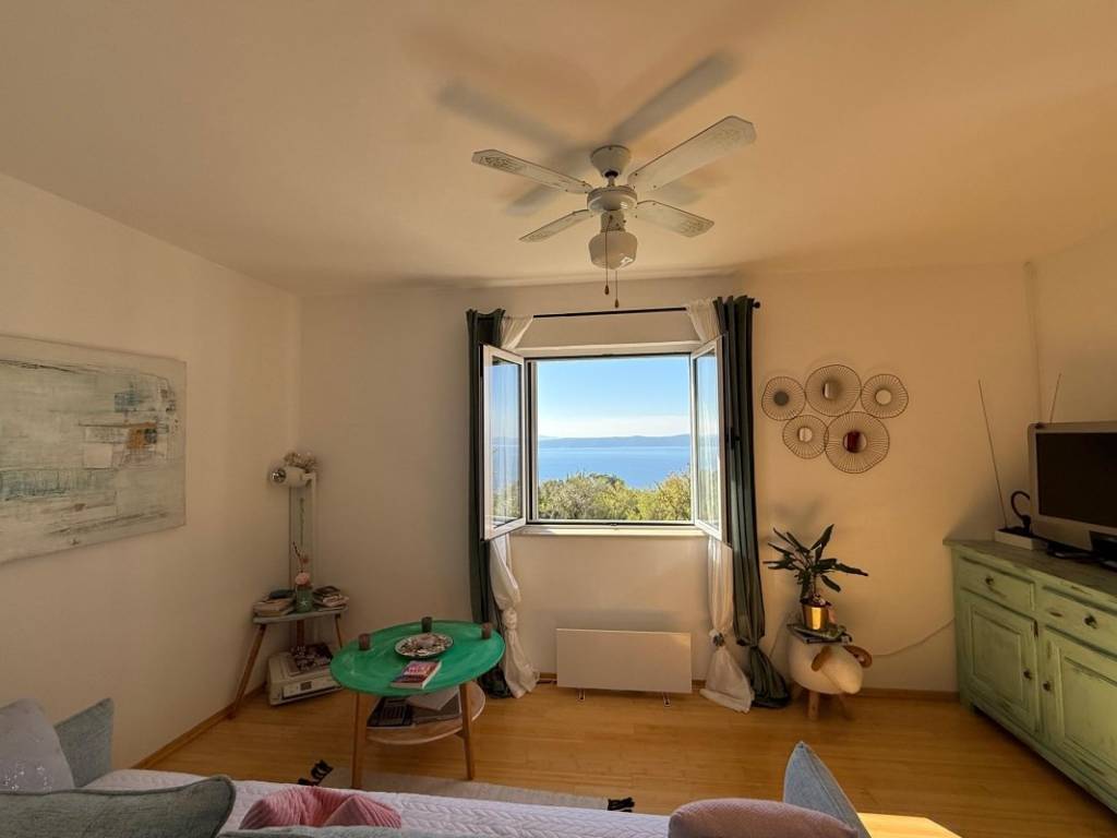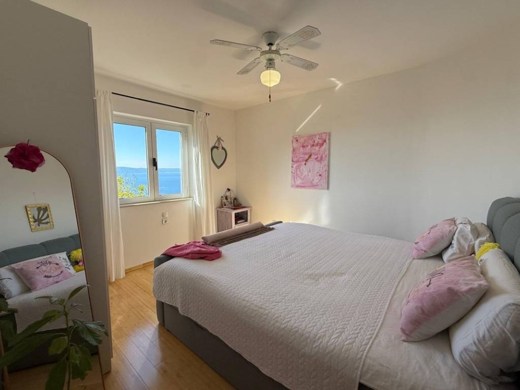 On the first floor, there is a kitchen, dining room, living area with an open sea view, and one bedroom.