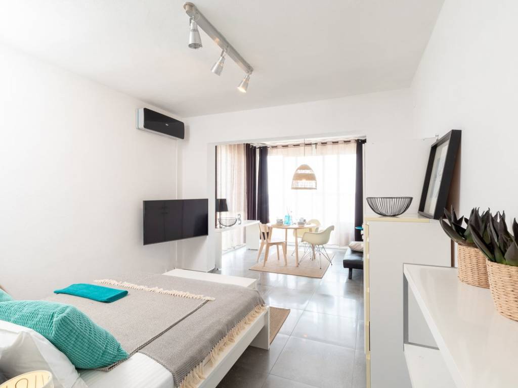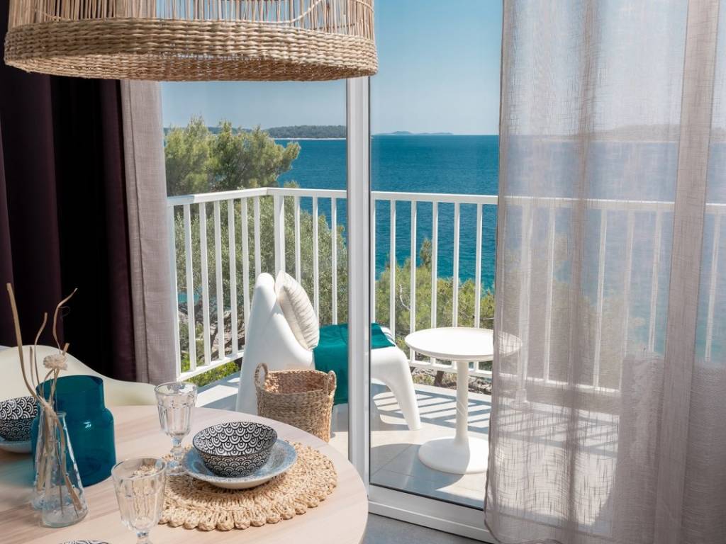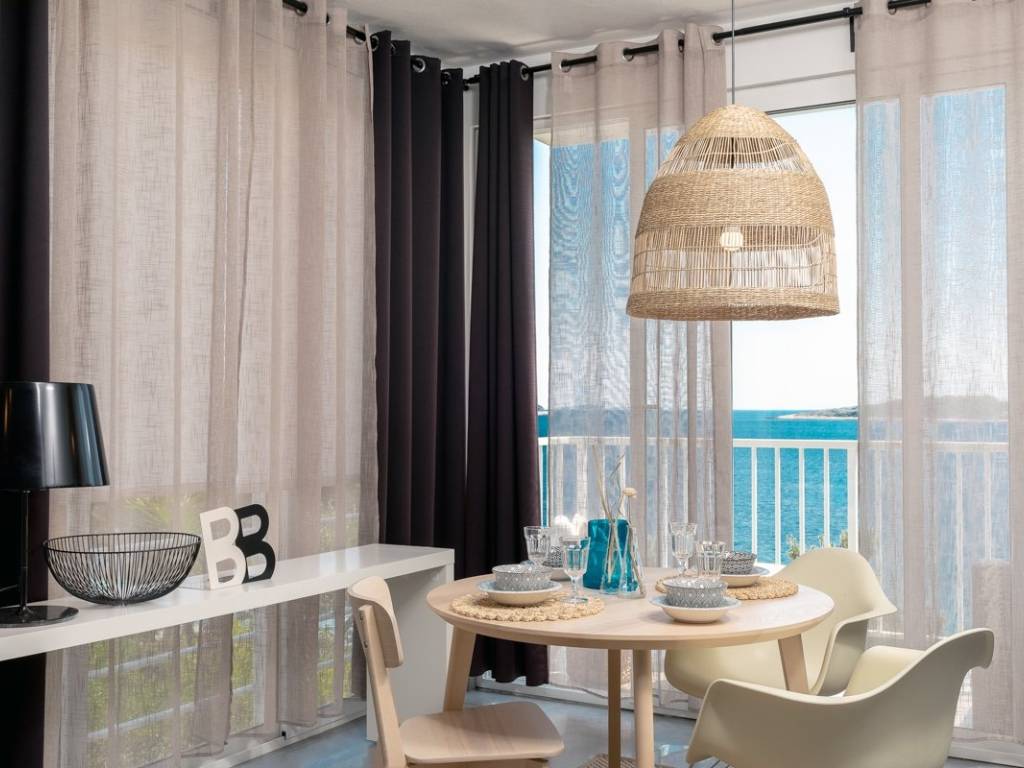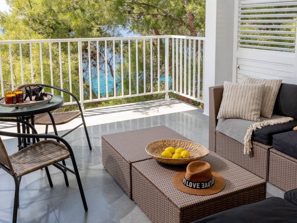 The upper floor, accessible through a separate entrance as well as the internal staircase, accommodates two apartments; a one-bedroom unit and a studio, each with its own covered terrace or loggia offering stunning panoramic views of the sea and surrounding islets.