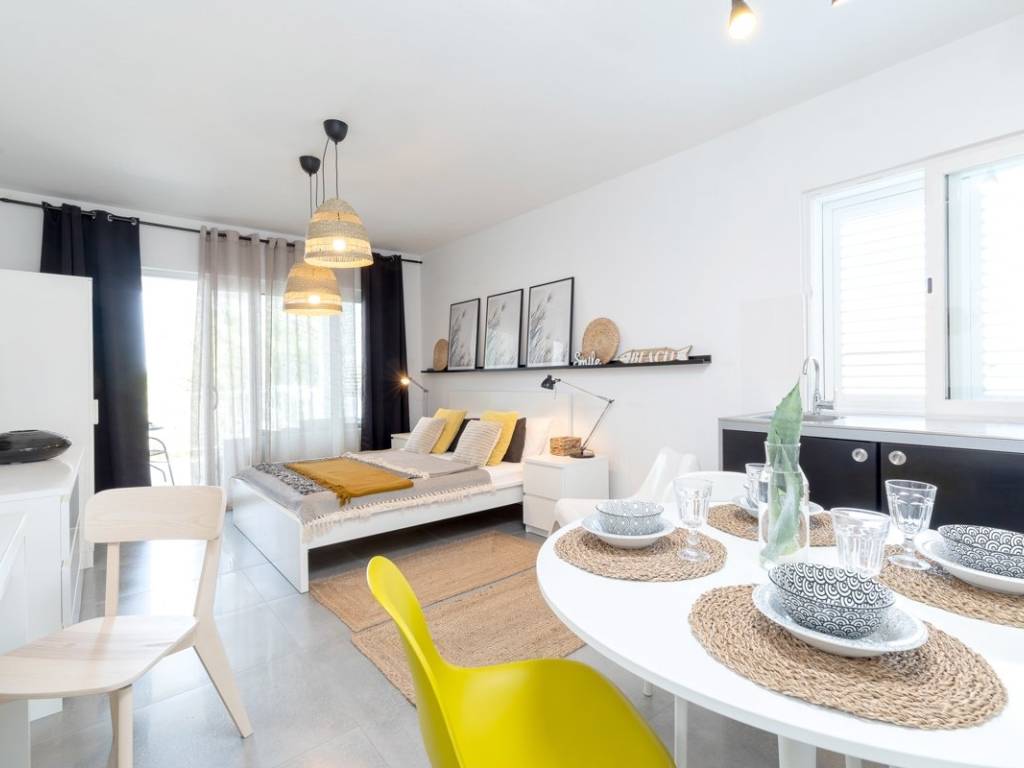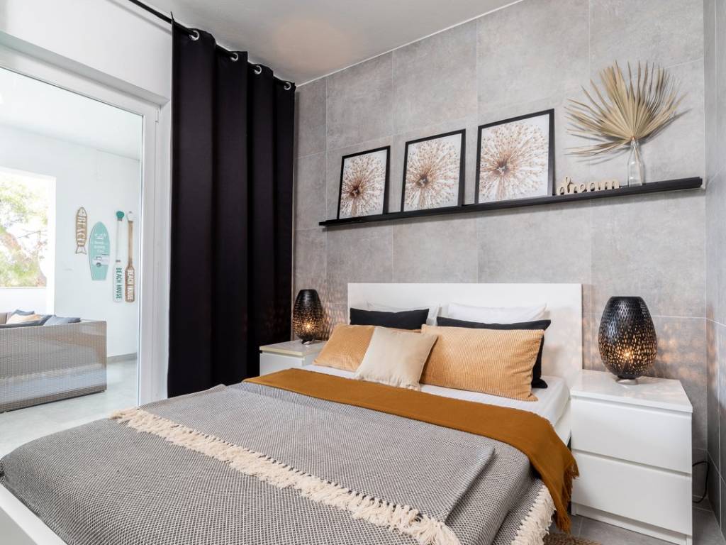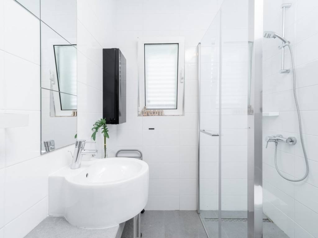 The total living area is divided into three units that can function independently or as one connected residence, thanks to an internal staircase that discreetly links the lower and upper levels. The elevated ground floor features an apartment with a spacious open-plan living area, kitchen, and dining room, extending onto a large covered terrace the perfect spot to relax and enjoy breathtaking sea views. This level also includes two bedrooms, a large bathroom, and a storage room.