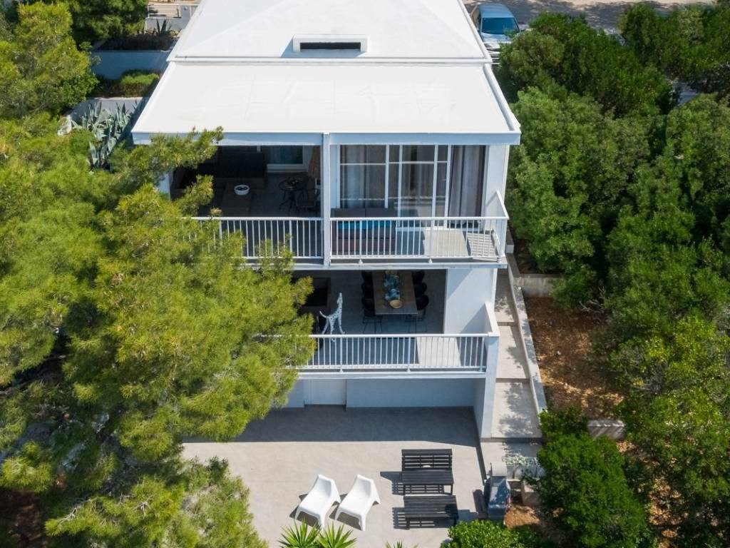 Behind the villa is a landscaped area with parking for several vehicles, while the basement includes additional storage space. A charming pathway through a pine forest leads directly to the sea and the nearby beach, creating a unique connection between nature and the Mediterranean lifestyle.