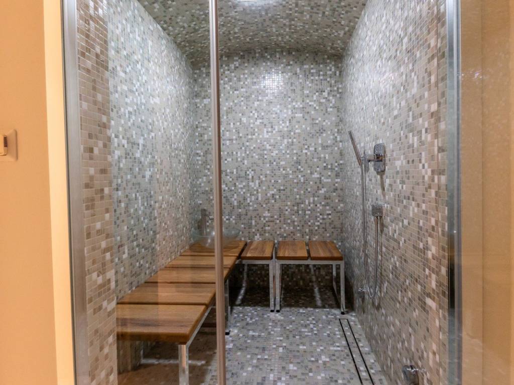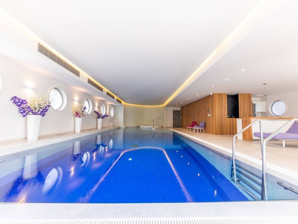 Floor 0: Spa zone 64 m2 indoor pool and 5 m2 jacuzzi with a bar and kitchen, TechnoGym fitness, steam room, home cinema and wine cellar.