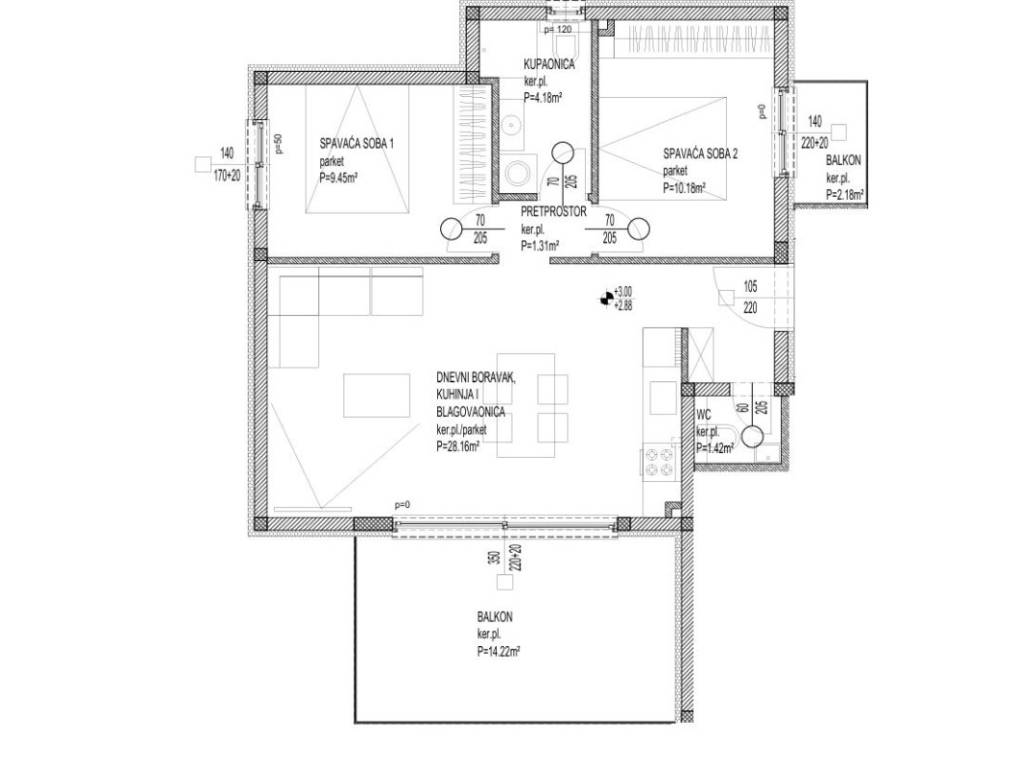 The apartment is oriented to the southwest, which provides it with plenty of natural light throughout the day, and its total area is 54,70 m. The floor plan consists of an anteroom, bathroom, toilet, two comfortable bedrooms, as well as an open space that combines the kitchen, dining room and living room perfect for everyday living and relaxation. The living area and a bedroom open onto a 16,40 m balconies.