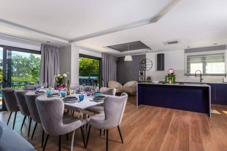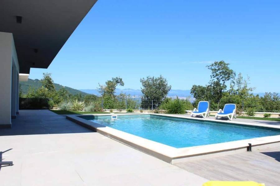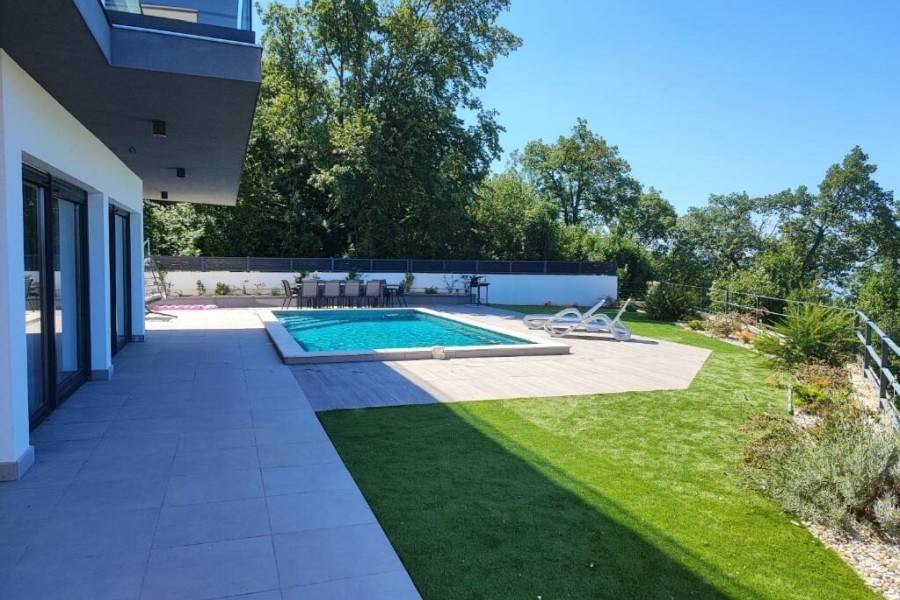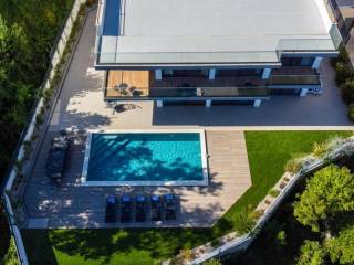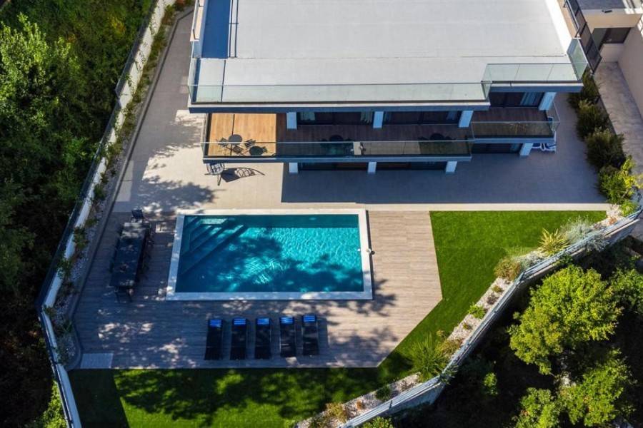 A modern villa with panoramic sea views and the Kvarner islands is located near Lovran. The nearest beach is approximately a five-minute drive away.