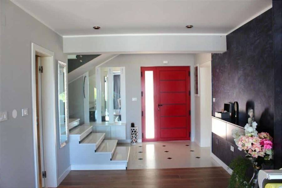 High-quality materials were used in the construction and furnishing. The house is equipped with underfloor heating with a heat pump, fan coils for air conditioning and ventilation, video surveillance, an anti-burglary system and a video intercom. There are two garages and one outdoor parking space, protected by a fence and a high hedge.