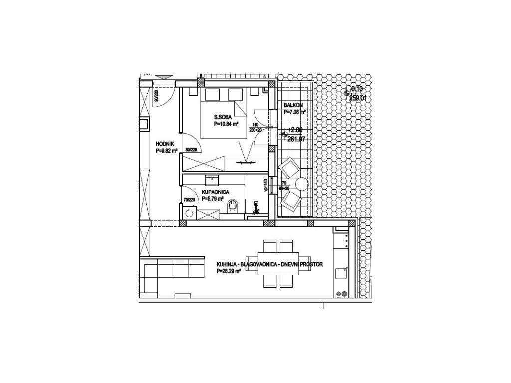 The apartment consists of a kitchen with a dining room, a bathroom and one bedroom and a loggia. It is equipped with underfloor heating in the bathroom, a Geberit built-in cistern and a built-in shower. It is oriented to the southwest, which ensures plenty of natural light throughout the day. The location is extremely practical quiet and surrounded by nature, but at the same time very close to the city, the sea and all necessary amenities.