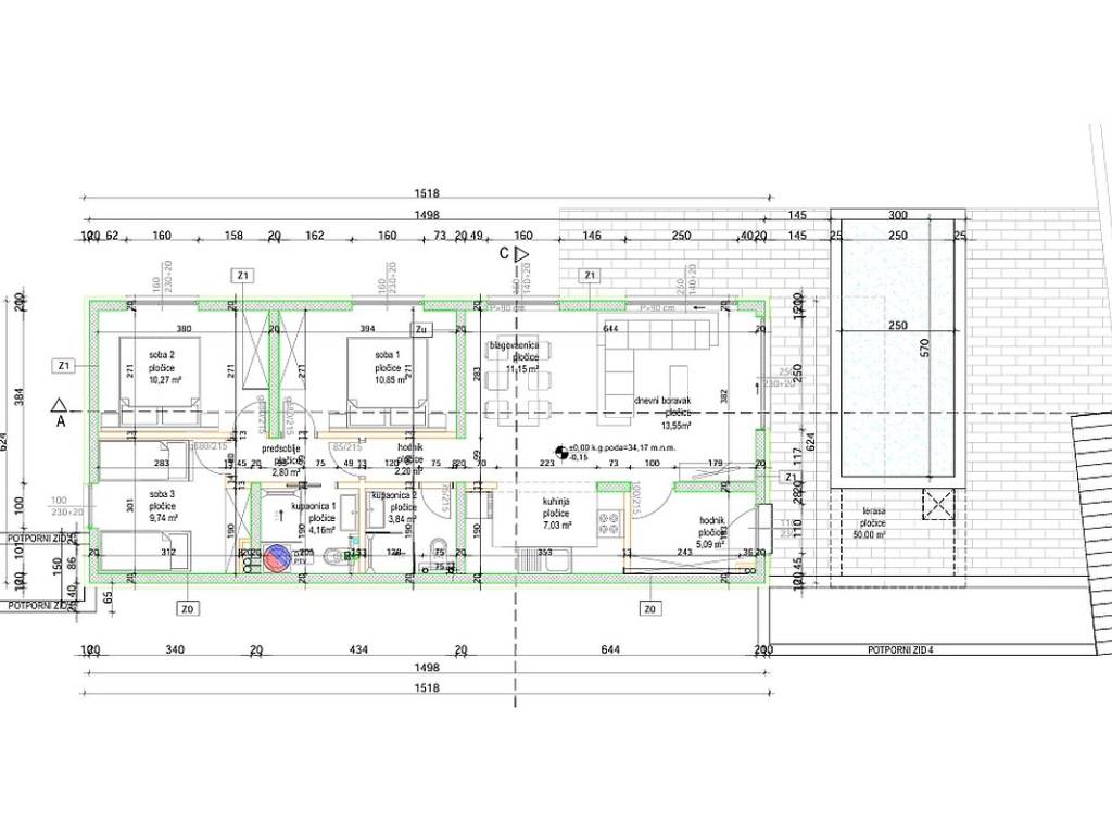It is located in a smaller residential building with only three apartments and is located on the ground floor of the building. It has 80,08 m and consists of an anteroom, two hallways, three bedrooms, two bathrooms, a kitchen with a dining room and a living room that leads to a paved terrace and a garden with a pool of a total of 160,81 m. The garden and pool provide additional space for enjoying, sunbathing and socializing outdoors.