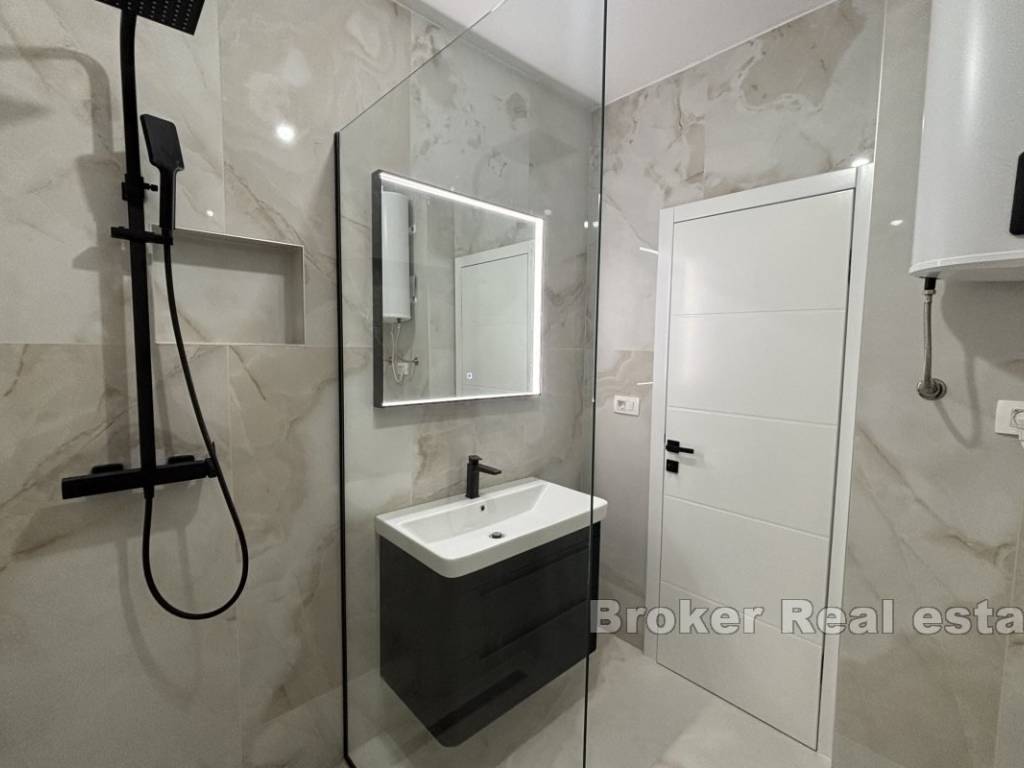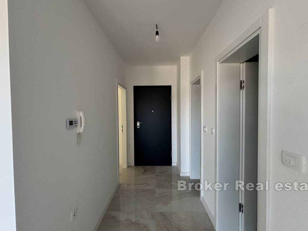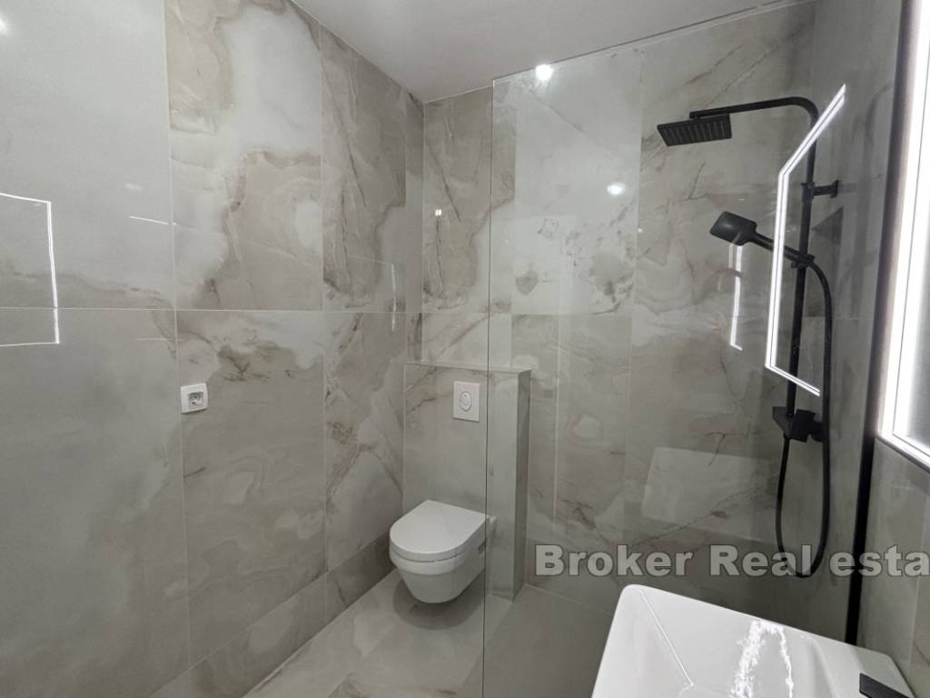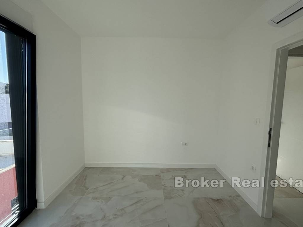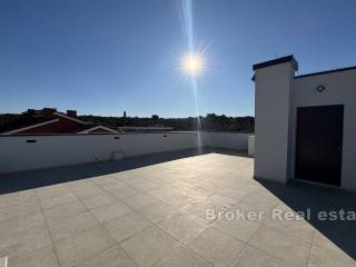 The apartment has 71,94 m and consists of an entrance hall, hallway, kitchen, dining room and living room with access to a terrace of 13,64 m and three bedrooms and two bathrooms. The apartment also has an uncovered roof terrace of 73,70 m with a beautiful panoramic view of the sea. High quality materials were used in the construction, and heating and cooling are provided by 4 air conditioners. The penthouse has two outdoor parking spaces behind the building.
