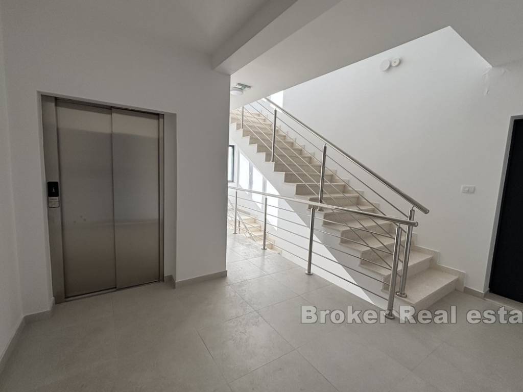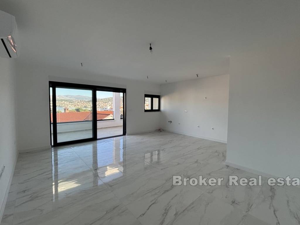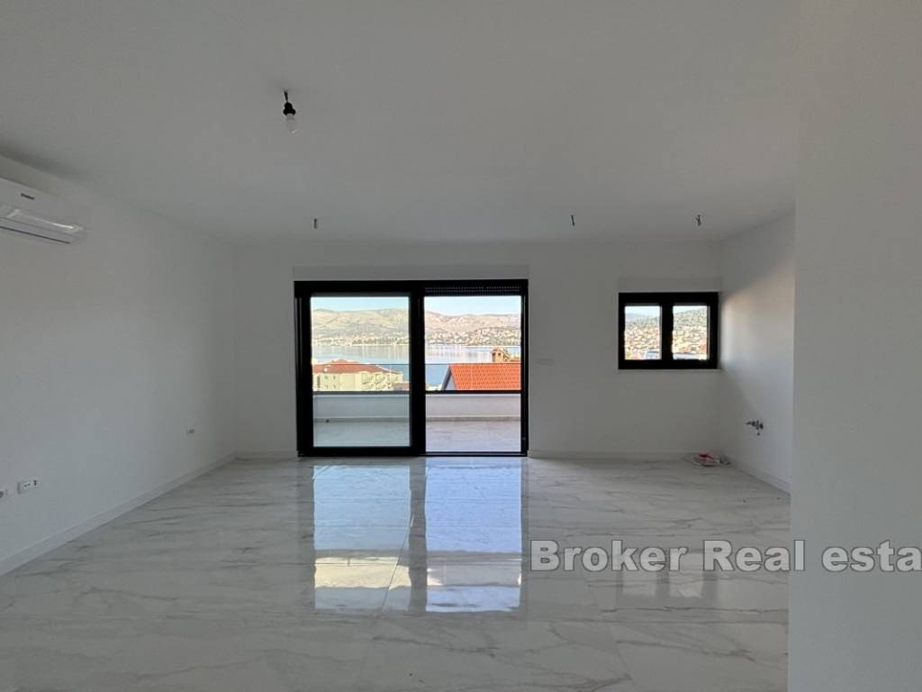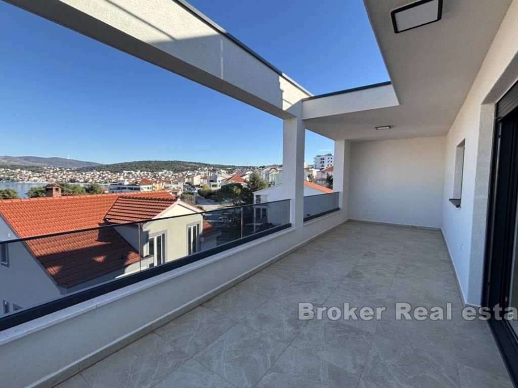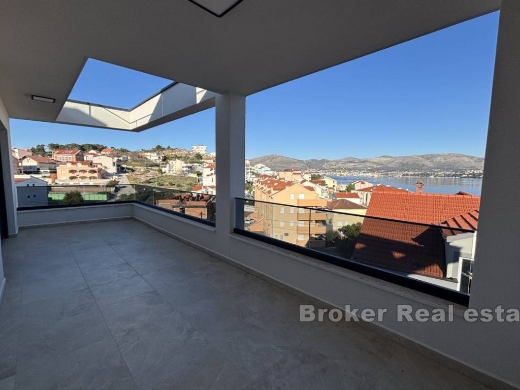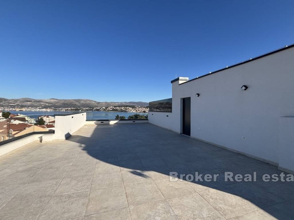 Luxurious three bedroom penthouse on the north side of the island of Čiovo, in Okrug Gornji. It has an open sea view and is located on the second floor of a residential building with an elevator.