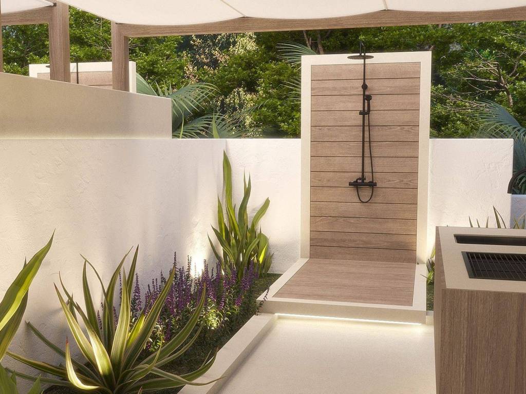 On the ground floor there is a large living room with an open-concept kitchen and dining room that has direct communication with the outdoor terrace, swimming pool, barbecue area and family dining.