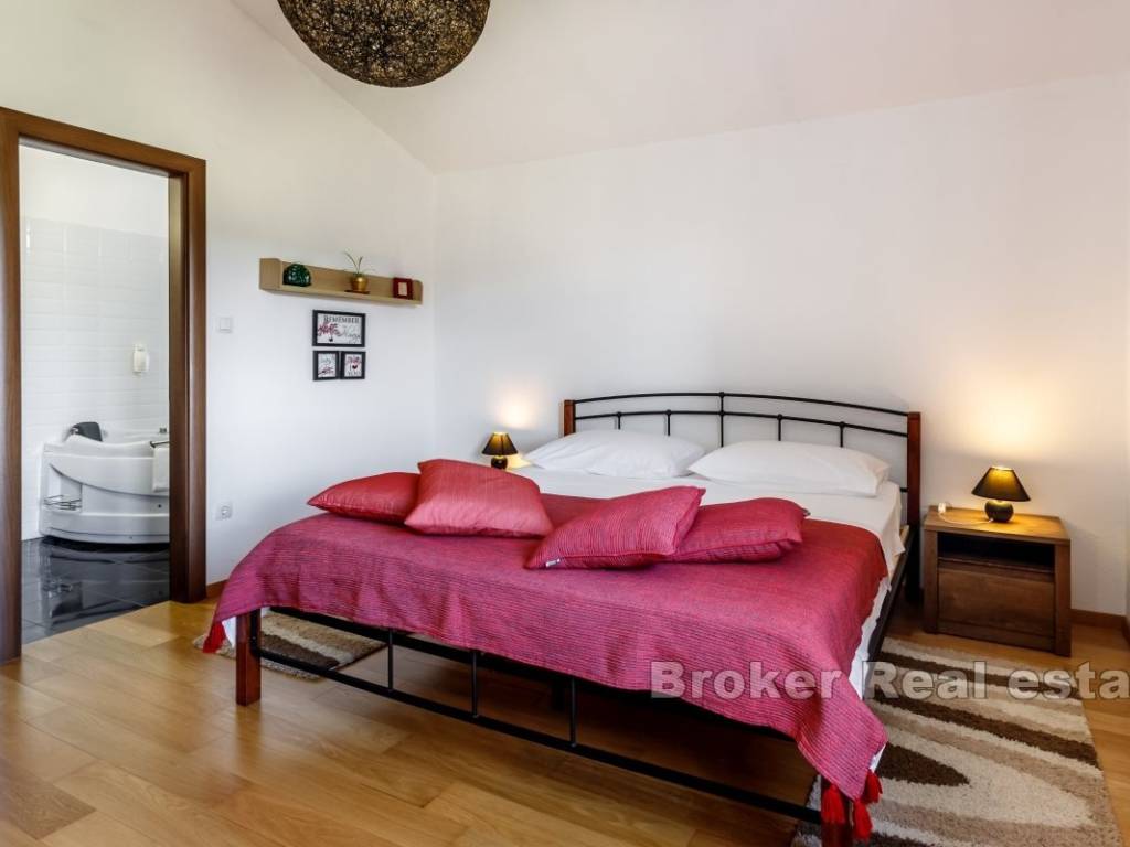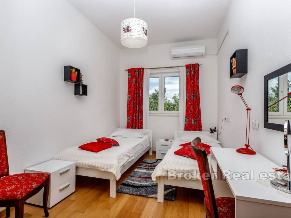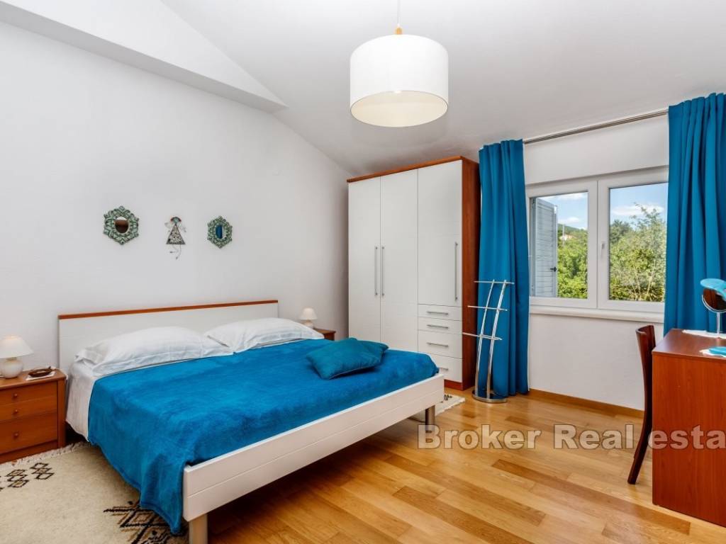 In the beautiful spacious garden, cultivated with numerous fruit trees and Mediterranean plants, there is a swimming pool with a sunbathing area and a large barbecue, while behind the house, in front of the entrance to the garage, there is another parking space for several cars.