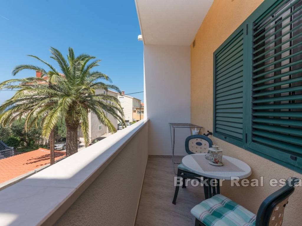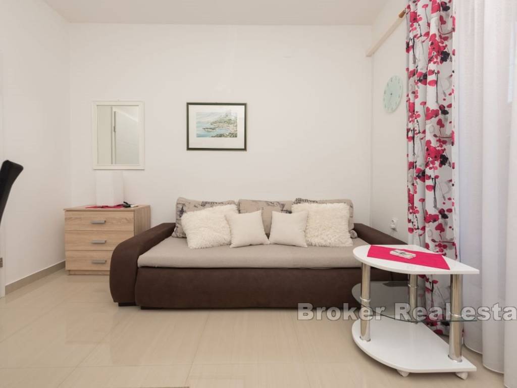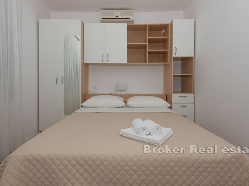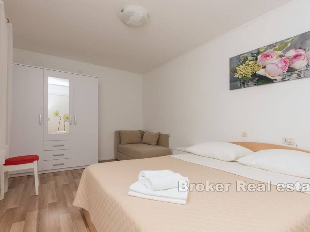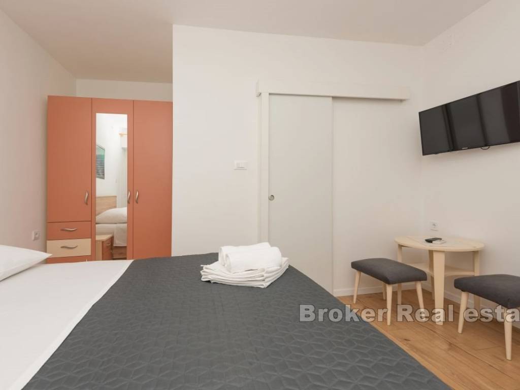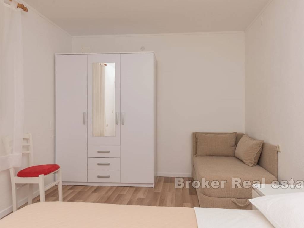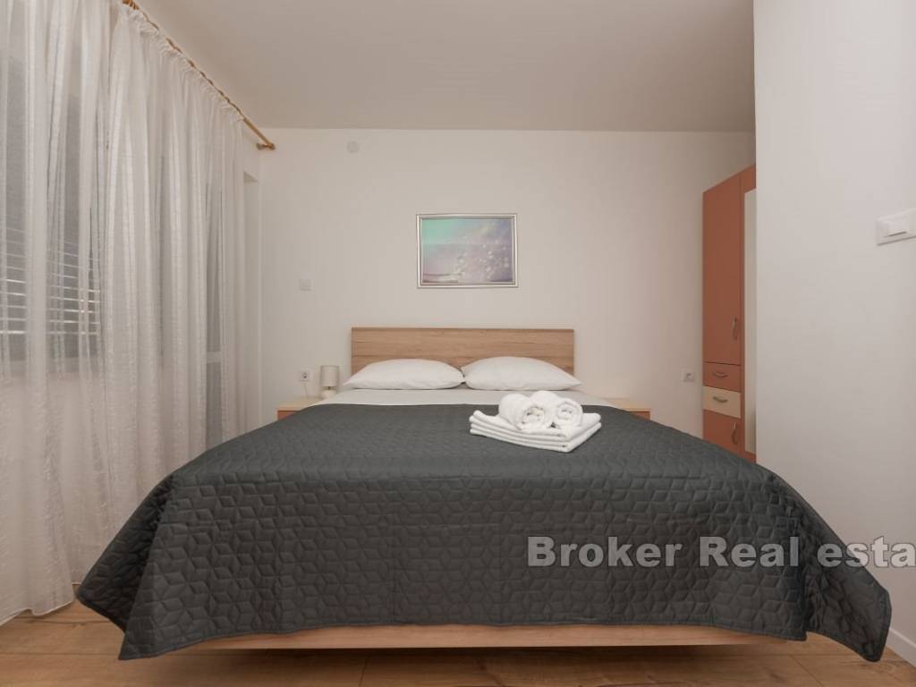 This semi-detached house with six apartment units is situated near the beach and all necessary amenities. On the ground floor, there is one two-bedroom and two one-bedroom apartments, while on the first floor, there are three one-bedroom apartments. All apartments have air conditioning in the living rooms, and five bedrooms also have their own air conditioning units. The house has parking for 4-5 cars, which is an additional advantage. The apartments are already well-established as a tourist business, providing a stable source of income and the possibility of further development. This property represents a good investment for those seeking a business opportunity in tourism or a comfortable living space with rental potential.