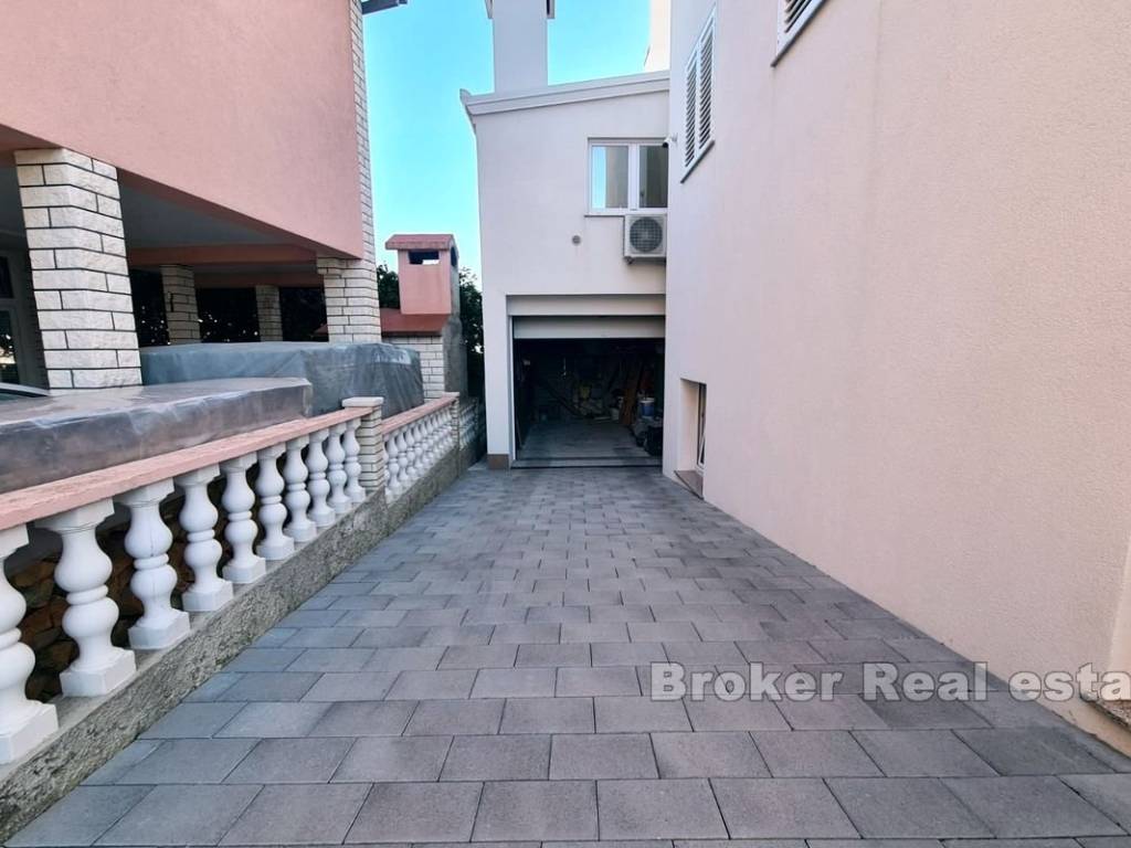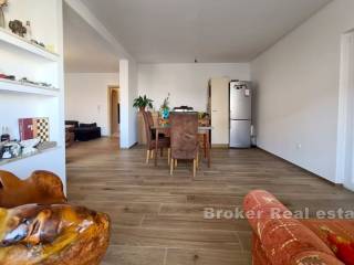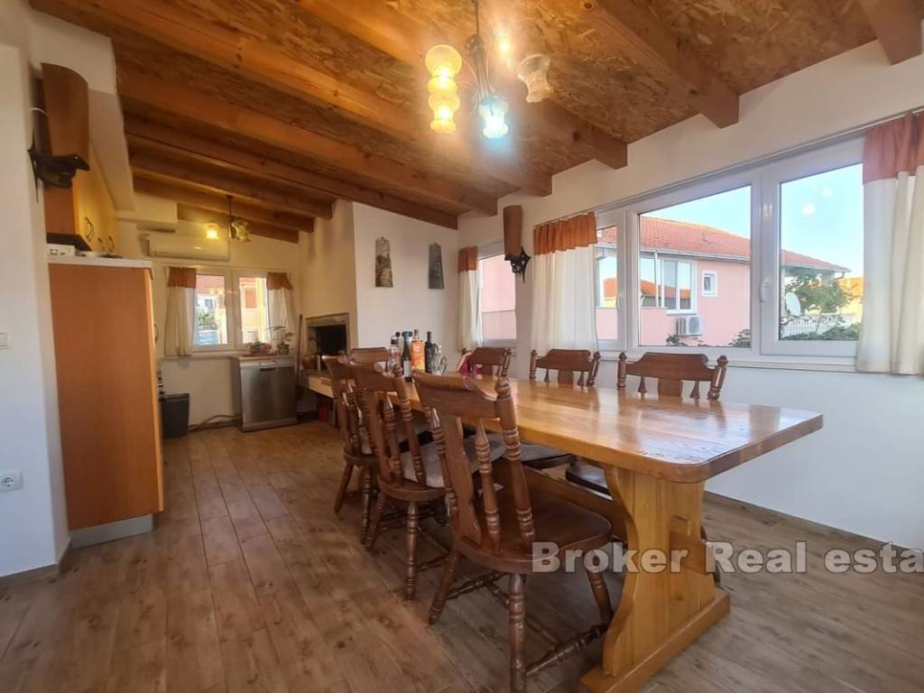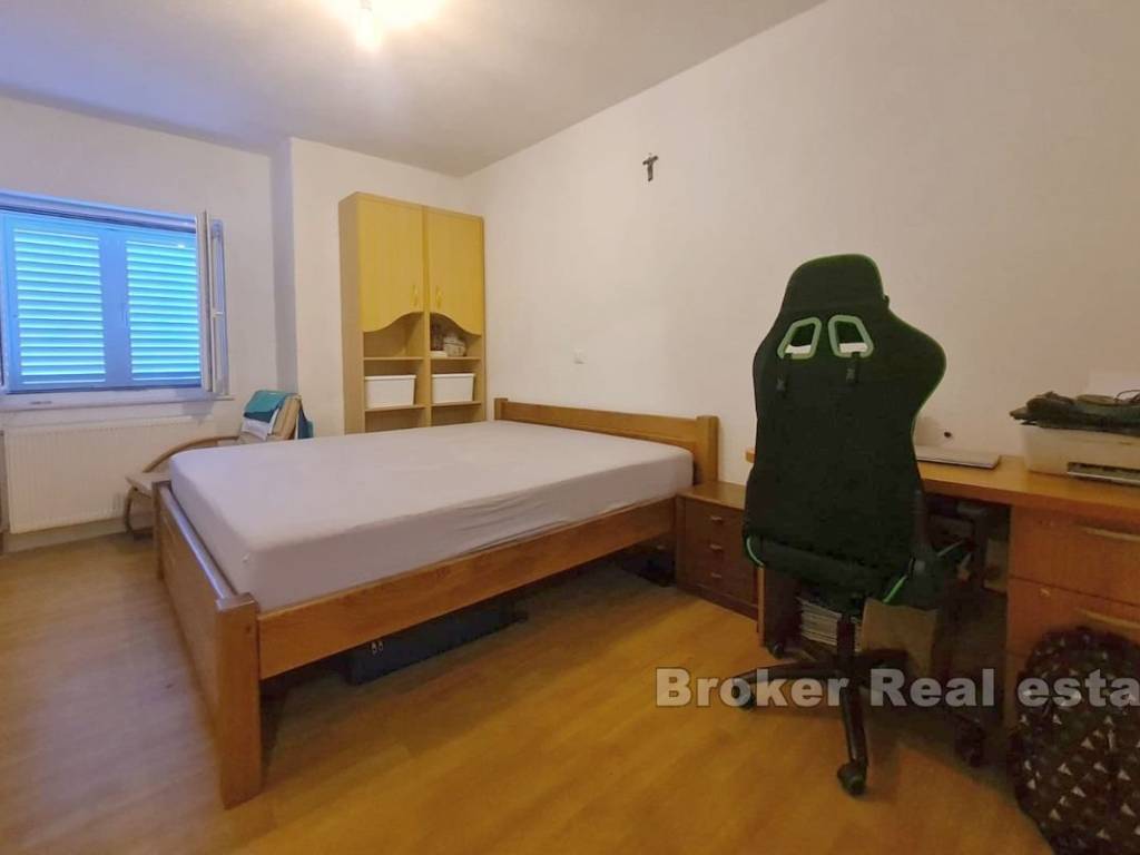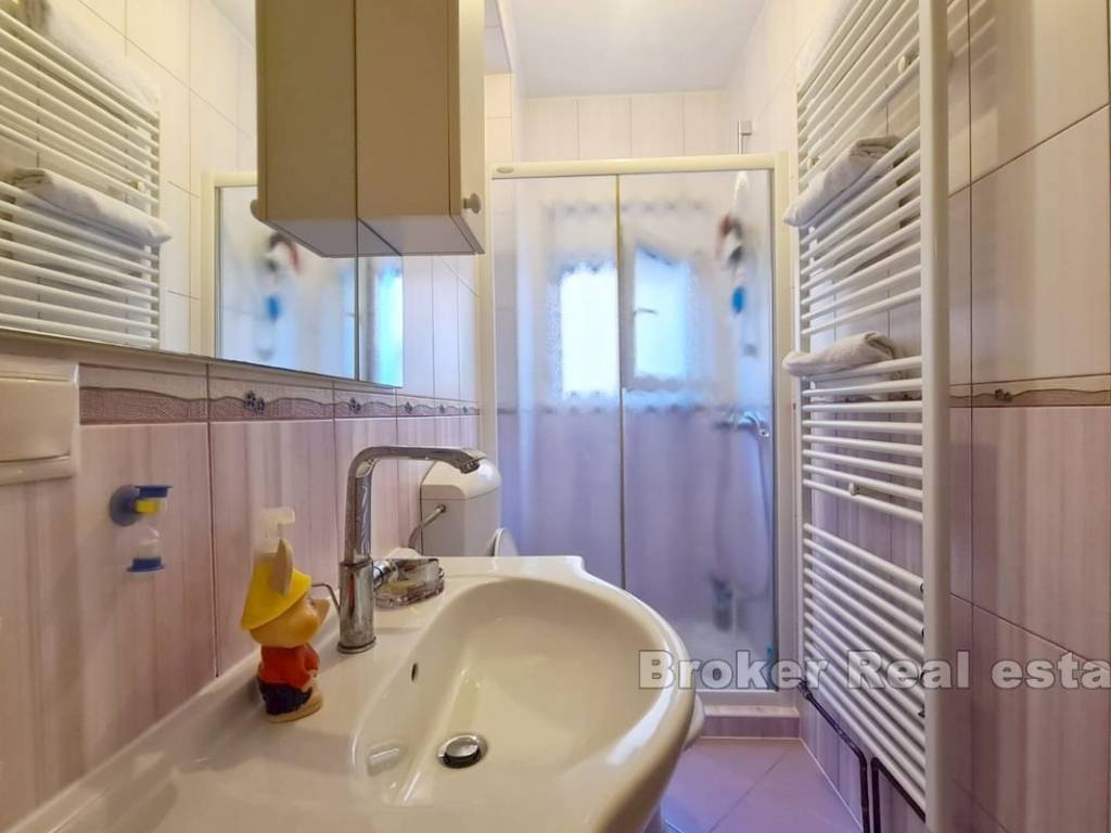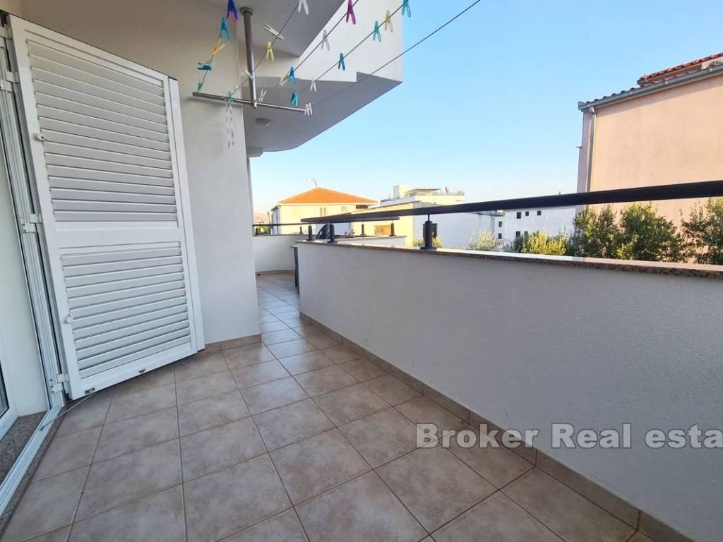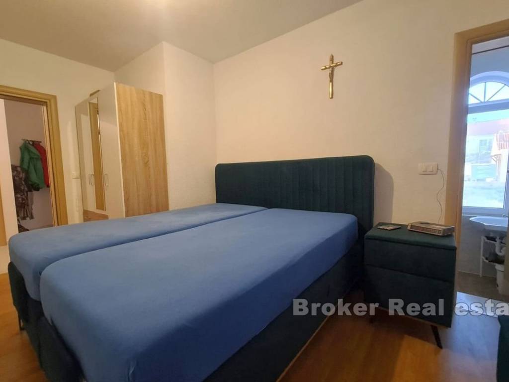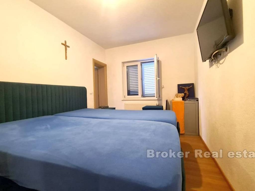A spacious three bedroom apartment with a partial sea view in Okrug Gornji, located on the southern side of the island of Čiovo, for sale. It is located on the first floor of a building surrounded by similar facilities. The apartment has 117,30 m and consists of a hallway, three bathrooms, three bedrooms, one of which has its own terrace and a spacious kitchen with dining room and living room with access to a covered terrace. The apartment is fully furnished and equipped and is being sold as such. The facility is equipped with three air conditioners and the apartment has a garage and an outdoor parking space. The property is excellent for vacation and tourist rental because of all the facilities it is equipped with and the airport, which is only 9 km away.