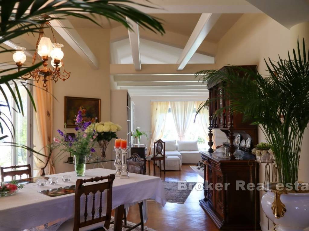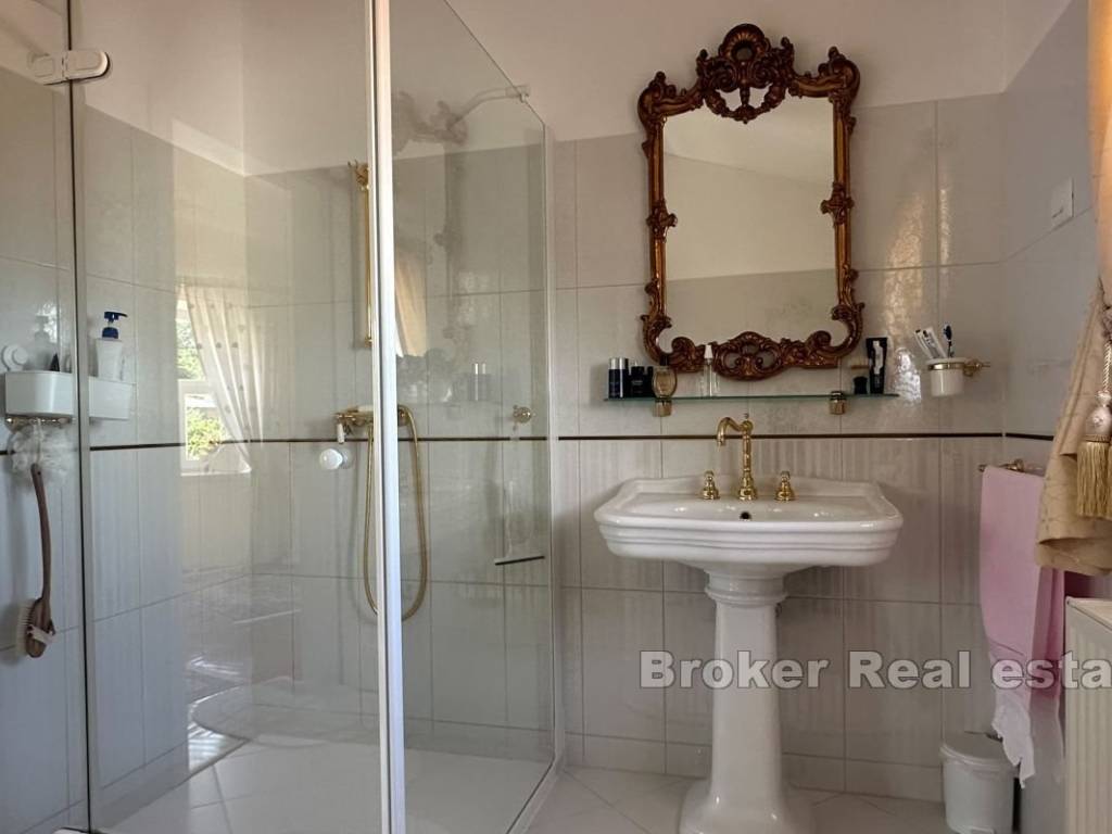 The yard is meticulously landscaped as a green garden, decorated with olive trees, lively flowers and a peaceful pond with a fountain. The lush lawn is equipped with an automatic irrigation system that ensures year-round greenery. The property also has a summer kitchen with a storage room of approx. 20 m2, suitable for cooking and outdoor gatherings. An additional storage room for tools is provided on the plot, and there is also a building permit for the extension of the swimming pool.