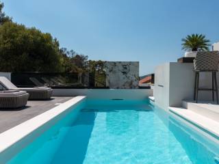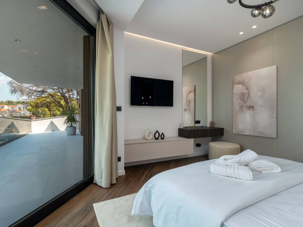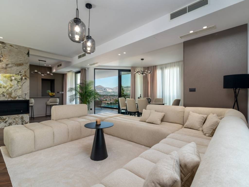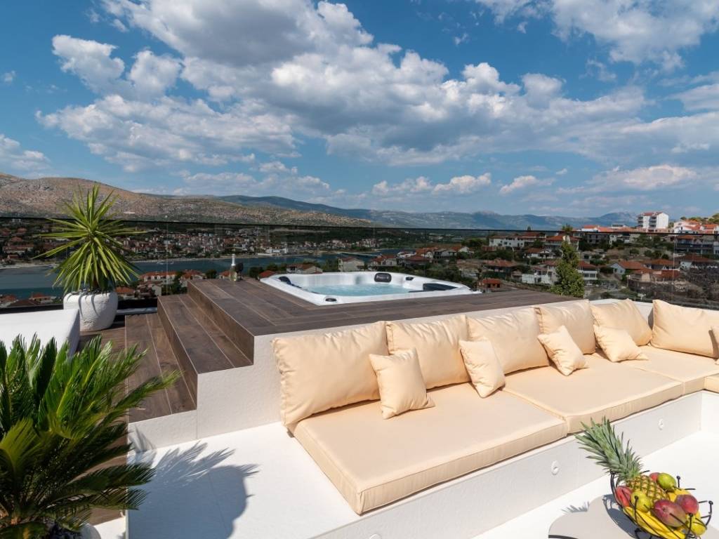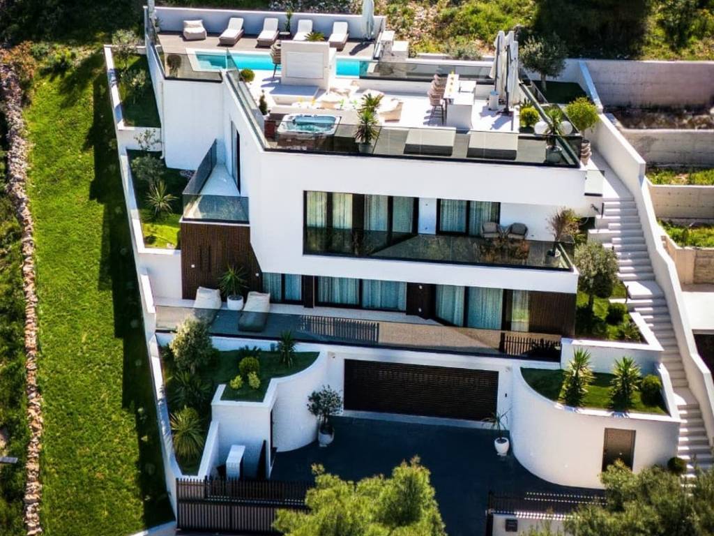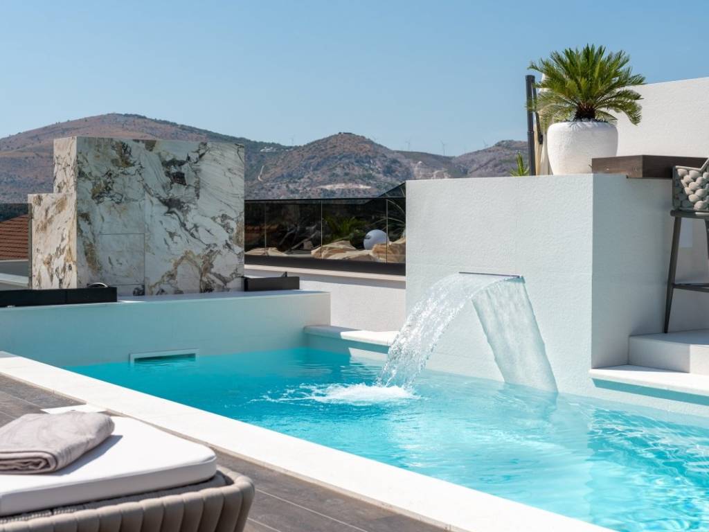 The aesthetic vision of the building is supported by the modern design of the villa on the cascading terrain and the biggest feature of the building is the roof terrace on which there is a swimming pool with a sunbathing area, a fireplace and a summer kitchen, a lounge area and a massage tub. The entire property is green and decorated with Mediterranean plants.