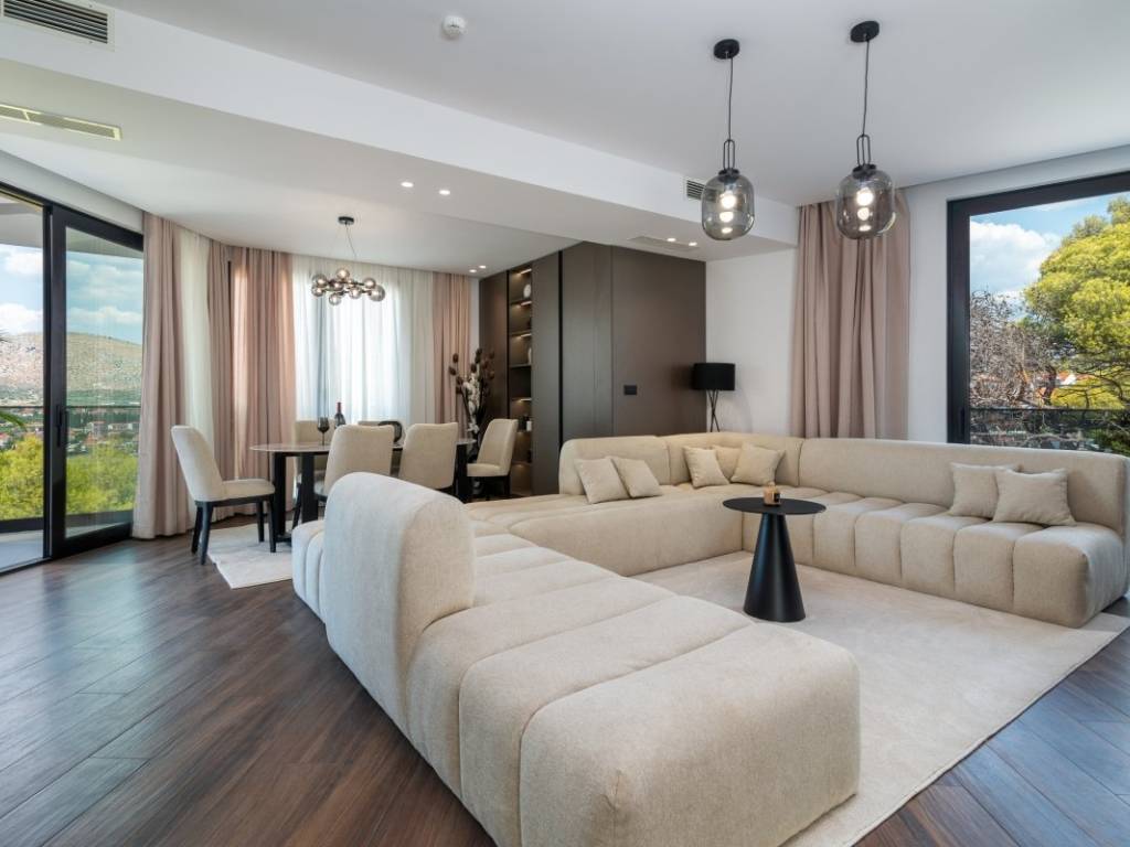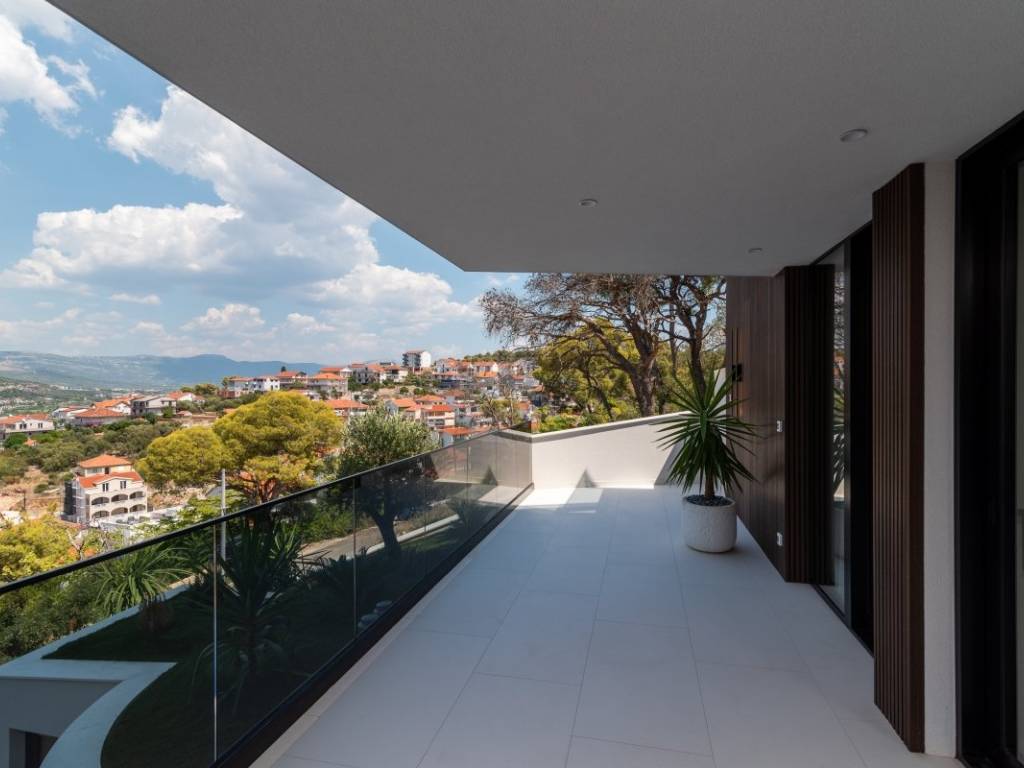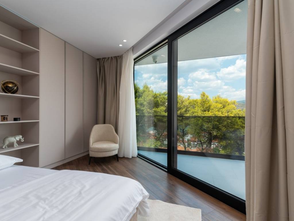 Exclusive luxury villa with sea view on the island of Čiovo, for sale. It is located on a plot of land measuring 465 m, while the residential area of the building has about 310 m. The villa is oriented to the north and its rooms are distributed over 3 floors and the advantage of the villa is the quiet surroundings of the forest and the proximity of the town of Trogir.