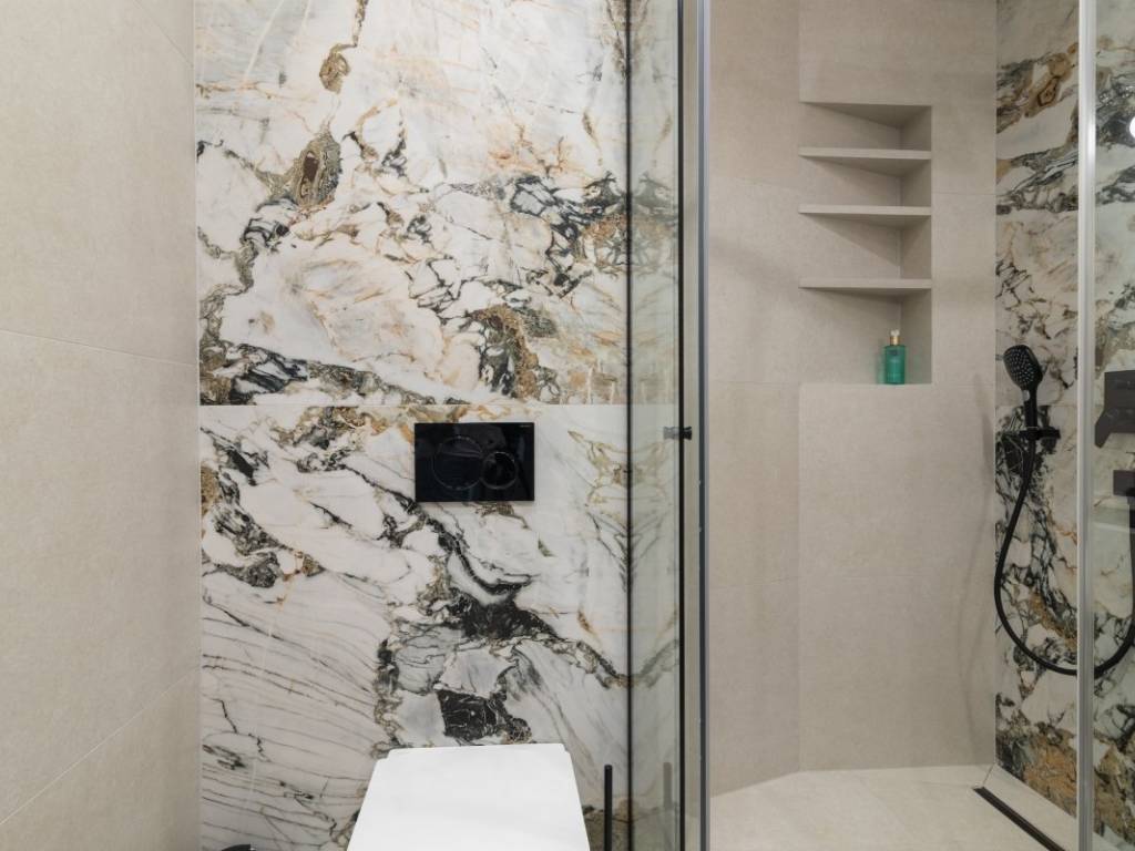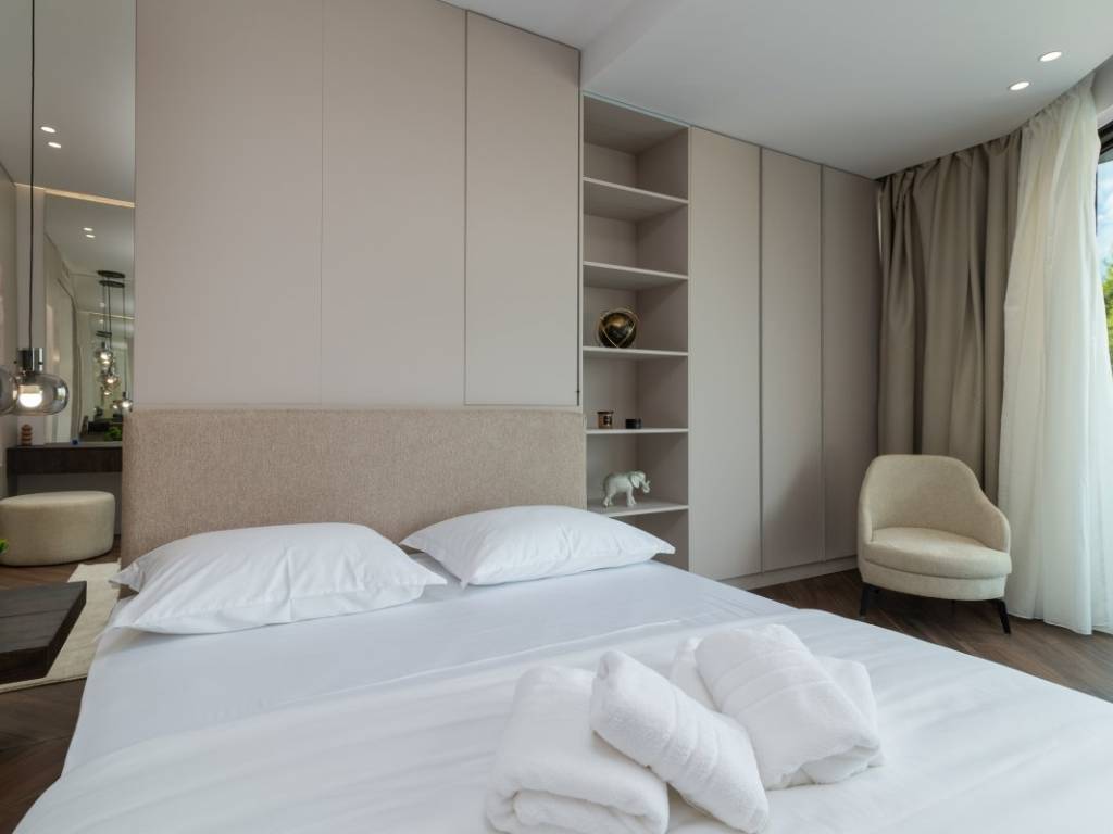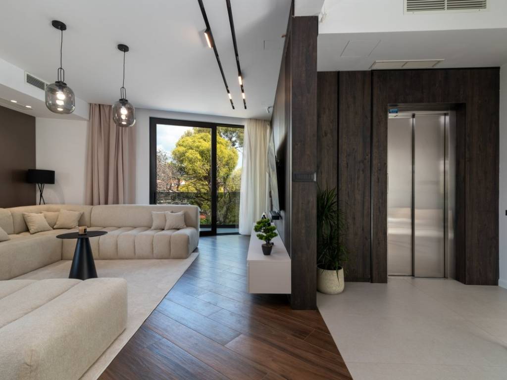 On the first floor there is a corridor, a laundry room, a bathroom, a sauna, a gym and a dressing room. On the same floor there is also a spacious garage for two vehicles. An internal staircase leads to the second floor, where there are three bedrooms, each with its own bathroom and access to the terrace with a view of the sea. On the top floor, there is an open concept living area, a hallway and a guest toilet. The entire villa is airconditioned through a heating, cooling and ventilation system and it also has underfloor heating. It is sold fully furnished and equipped with high quality custom made furniture. It has its own elevator and in addition to the garage, it also provides two outdoor parking spaces.