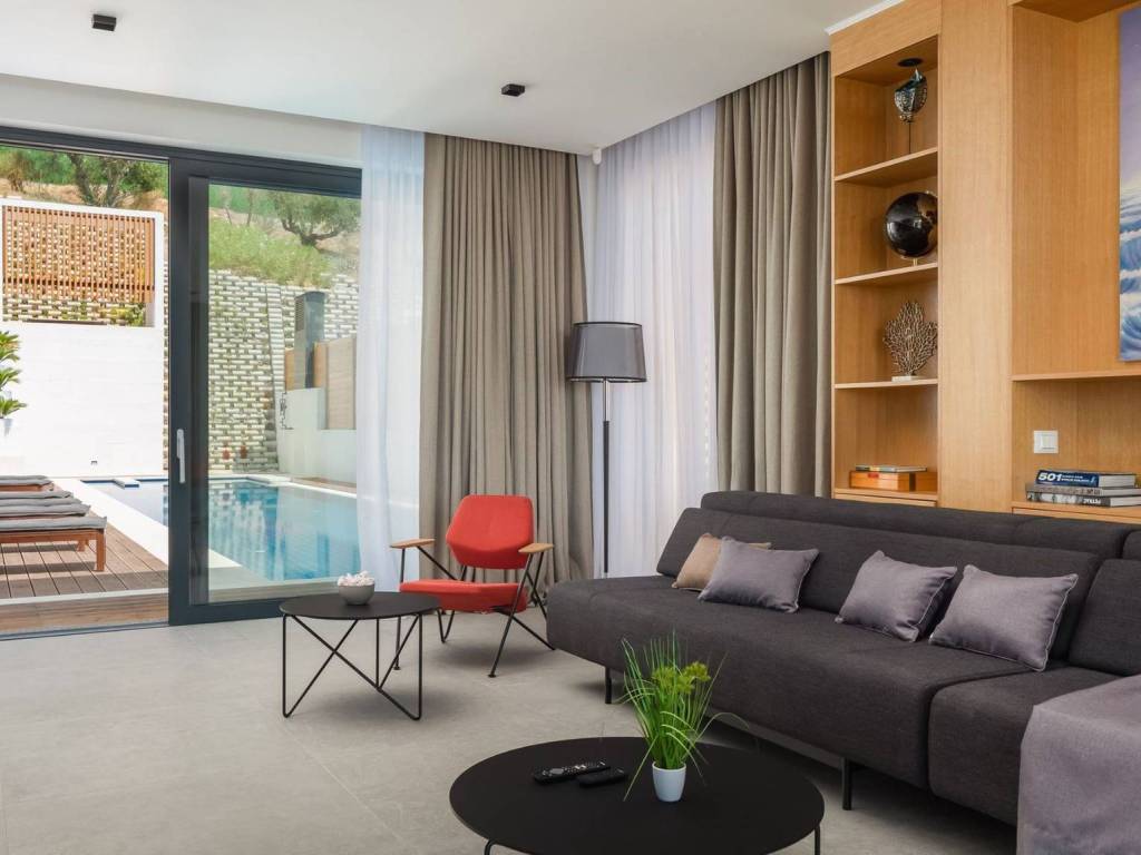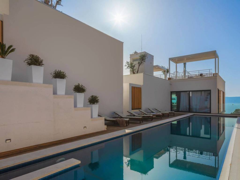 On the second floor, there is a spacious and richly equipped kitchen with a dining room, which was built using high-quality materials and equipment. The kitchen and dining room have a glazed south side, which provides the rooms with additional light and a beautiful view of the sea. The living room on the north side has a direct exit to the terrace where there is a heated swimming pool with a sunbathing area.