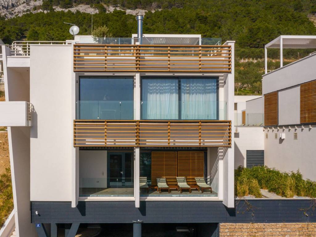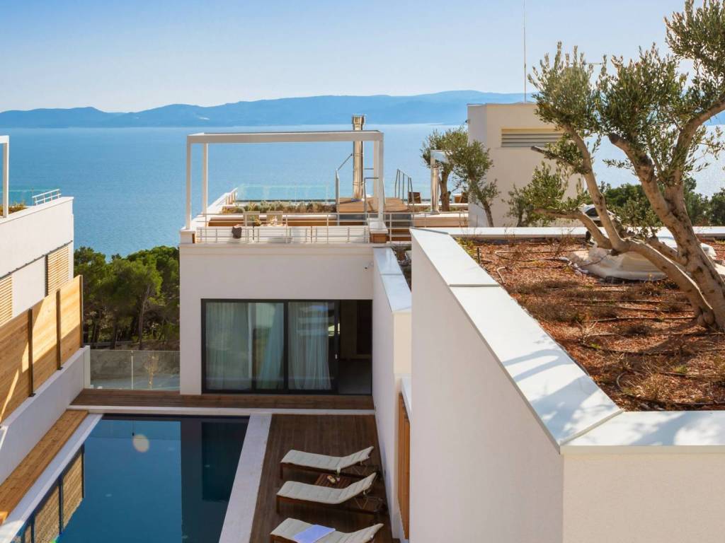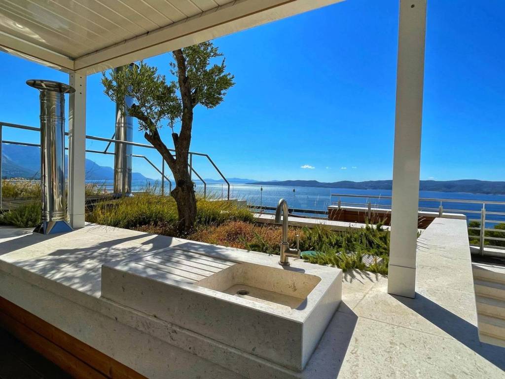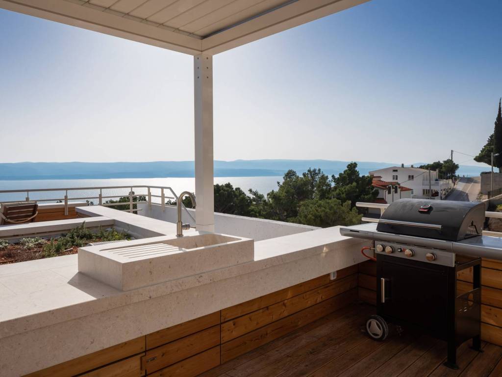 On the last floor of the villa there is a roof terrace with a total area of 93 m2, where there is a summer kitchen with a gas grill, a stone sink, a mini fridge, an ice machine, a dining table and an additional space for socializing and sunbathing. From the roof terrace there is a spectacular and unobstructed view of the sea and the islands of Brač, Hvar and Korčula.