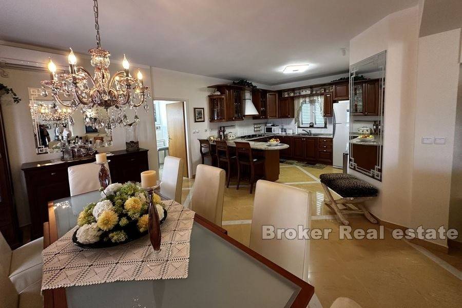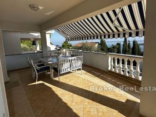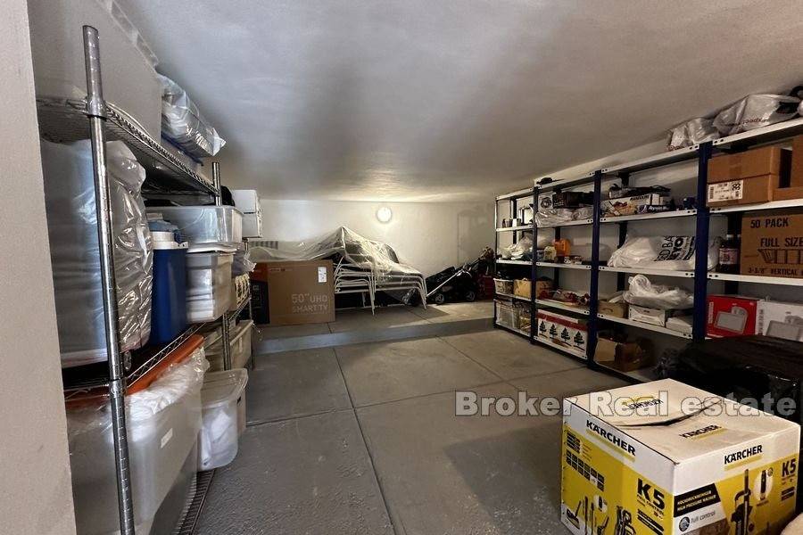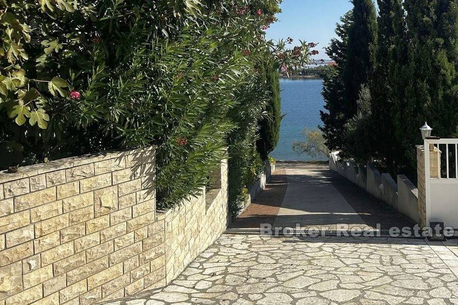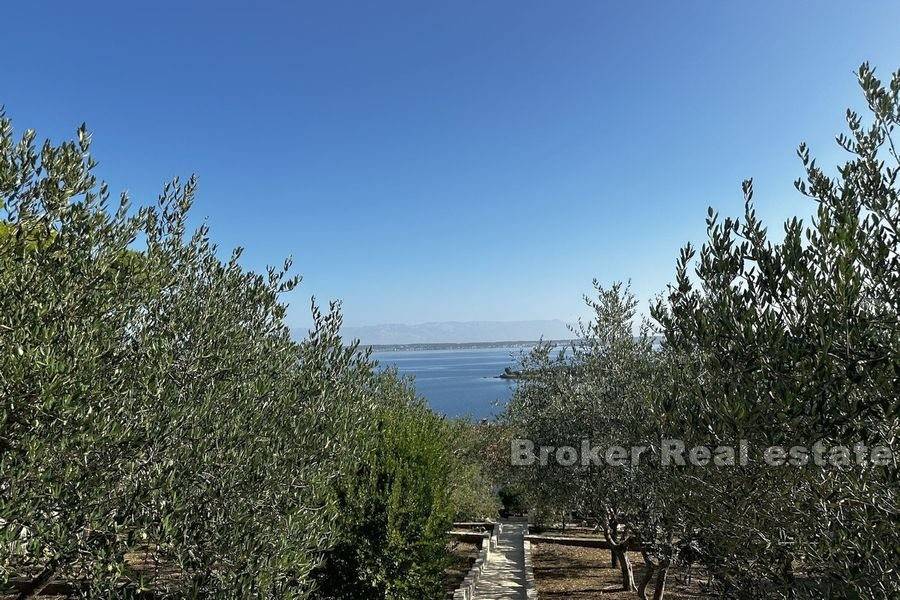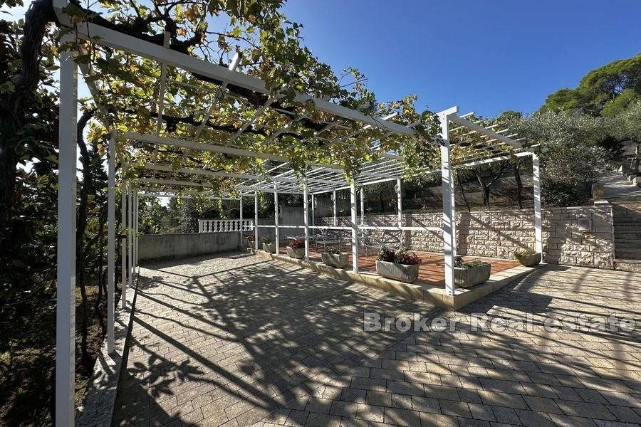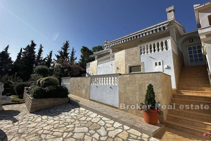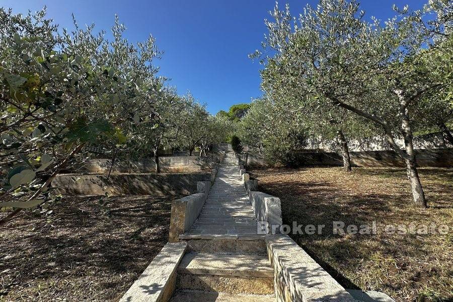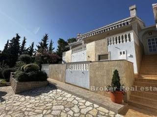 This spacious villa is located in the second row to the sea in a beautiful bay on the island of Ugljan. The property with a total of 302 m2 of living space is located on a spacious plot of 2140 m2. The villa extends over two floors. The ground floor consists of a large kitchen, dining room, living room, 3 bedrooms, each of which has its own bathroom, and a large storage room. The spacious living room opens onto a large terrace with a view of the sea. The terrace contains a barbecue and enough space for pleasant socializing in a nice environment. Through the garage, which is enough for two large cars, you enter the large basement, which has a lot of storage space. In front of the house there is enough parking space for several cars. The spacious garden is cultivated with olive and fruit trees and is well maintained. Behind the house there is a large space for socializing with complete garden furniture, while the rest of the land is decorated with Mediterranean greenery. There is more than enough space for a swimming pool on the land. The location of the house itself offers peace and privacy, and the proximity to the sea guarantees a pleasant and relaxing stay. The access road of the house leads to a walk that stretches throughout the place. The distance from the ferry is 8 minutes by car. The connection between the island and the city of Zadar is excellent throughout the year.