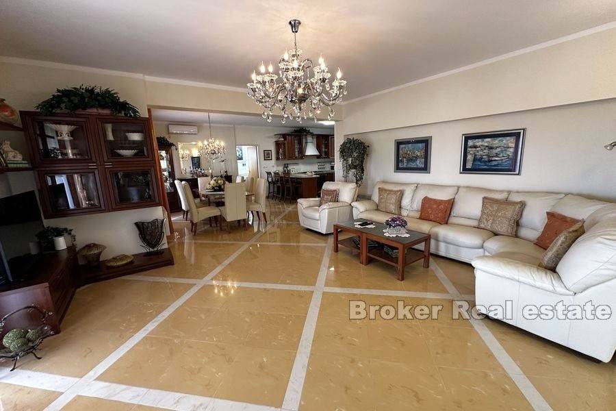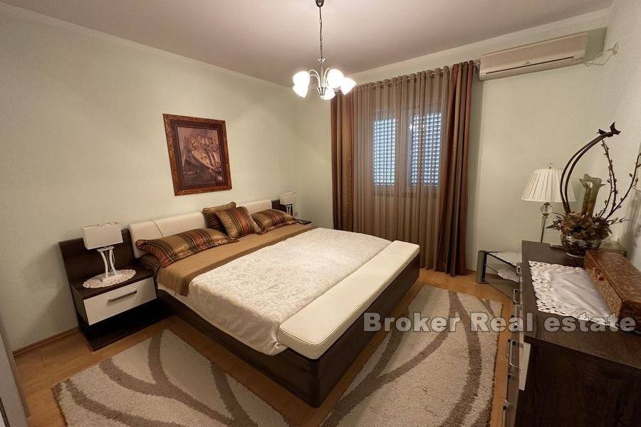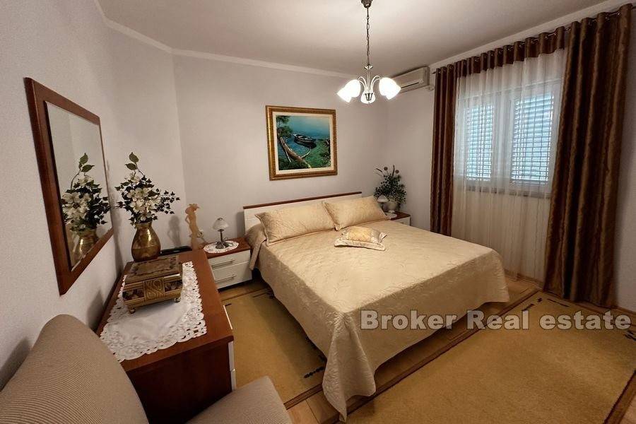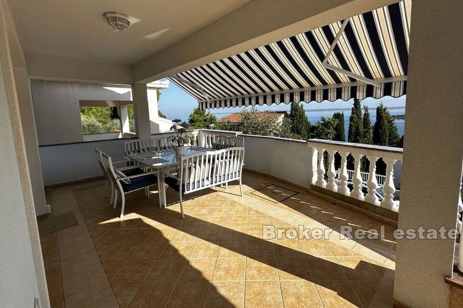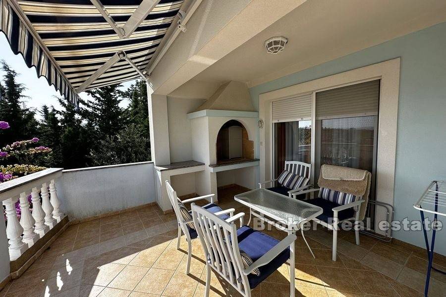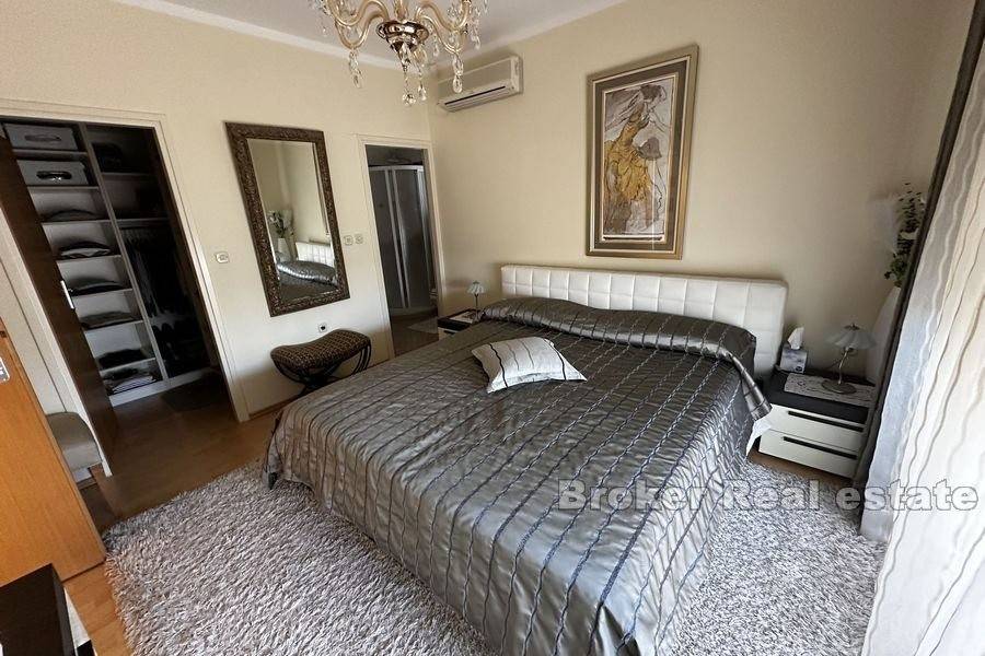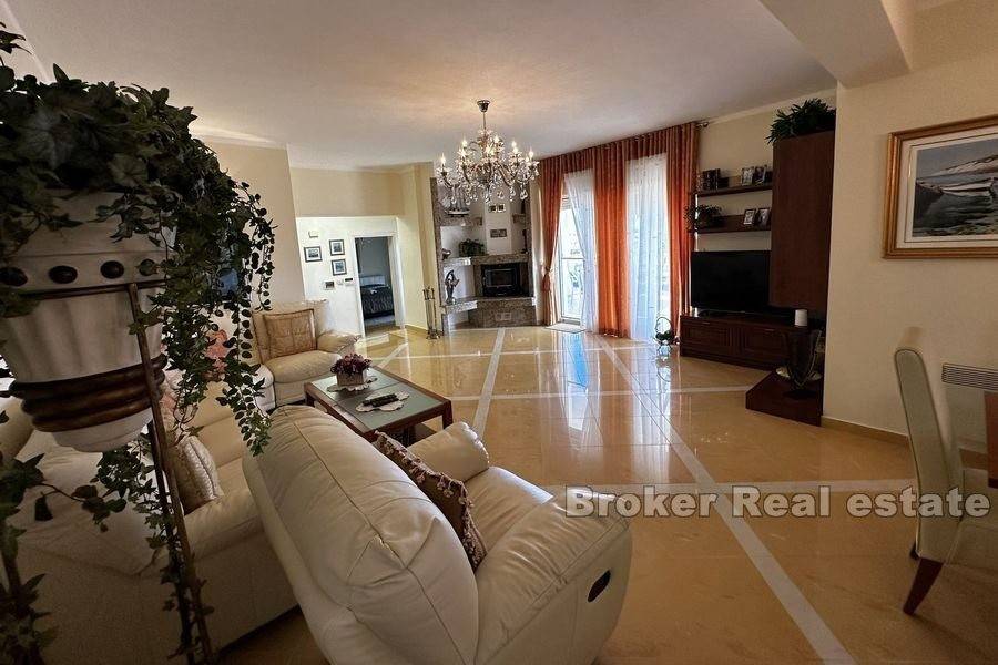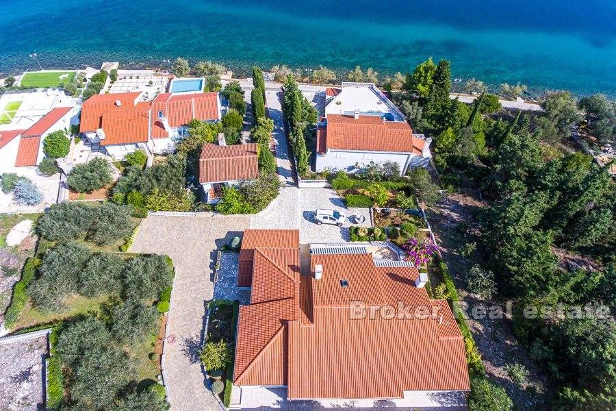 This spacious villa is located in the second row to the sea in a beautiful bay on the island of Ugljan. The property with a total of 302 m2 of living space is located on a spacious plot of 2140 m2. The villa extends over two floors. The ground floor consists of a large kitchen, dining room, living room, 3 bedrooms, each of which has its own bathroom, and a large storage room. The spacious living room opens onto a large terrace with a view of the sea. The terrace contains a barbecue and enough space for pleasant socializing in a nice environment. Through the garage, which is enough for two large cars, you enter the large basement, which has a lot of storage space. In front of the house there is enough parking space for several cars. The spacious garden is cultivated with olive and fruit trees and is well maintained. Behind the house there is a large space for socializing with complete garden furniture, while the rest of the land is decorated with Mediterranean greenery. There is more than enough space for a swimming pool on the land. The location of the house itself offers peace and privacy, and the proximity to the sea guarantees a pleasant and relaxing stay. The access road of the house leads to a walk that stretches throughout the place. The distance from the ferry is 8 minutes by car. The connection between the island and the city of Zadar is excellent throughout the year.