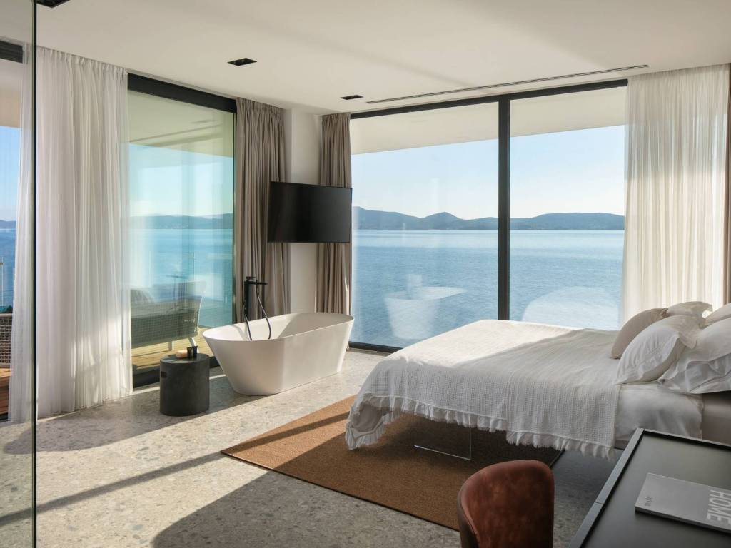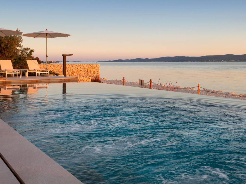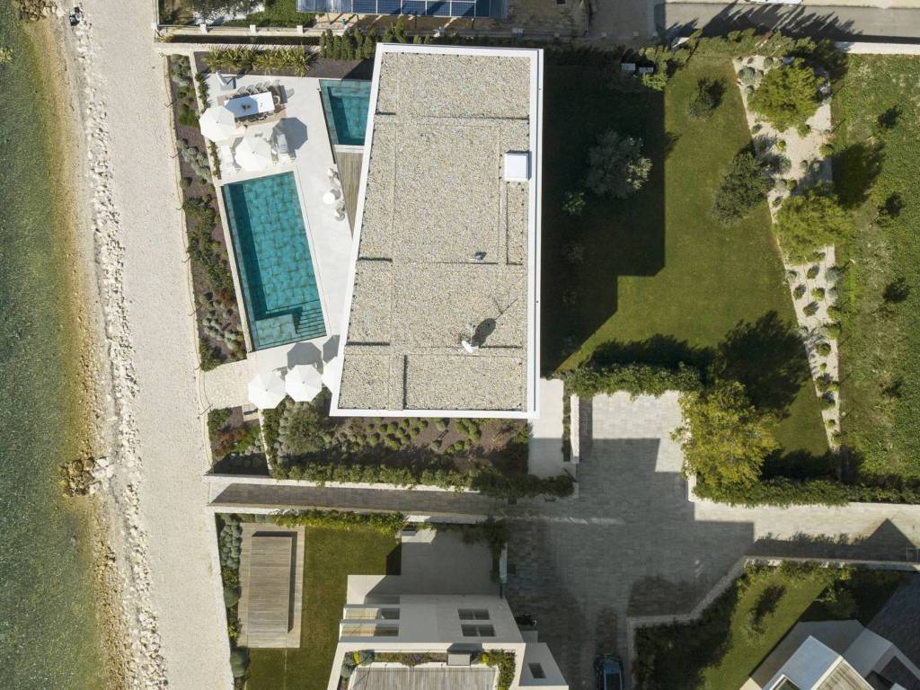 On the first floor, there is a Wellness area designed for enjoyment in the summer and winter months (by closing the glass walls, you get a closed, protected area). The space is equipped with an infinity pool and a sauna with an open view of the sea and nearby islands. On this floor there are also two master bedrooms, each with its own bathroom and terrace.