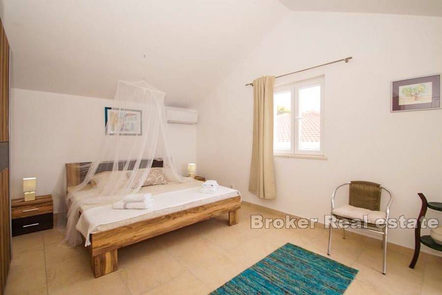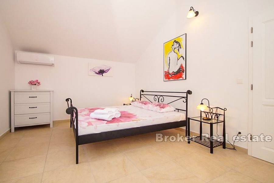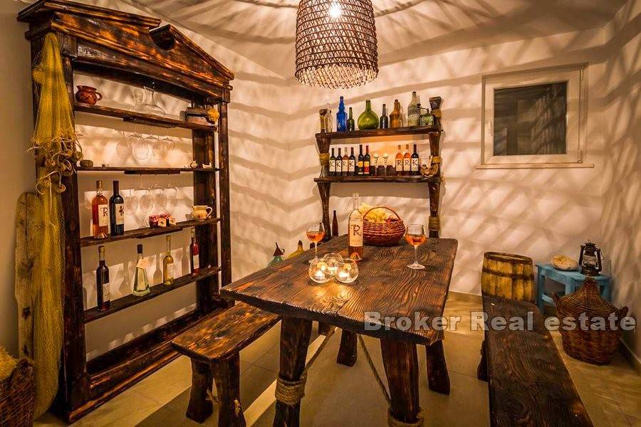The villa with a living area of 250m2 is located on a plot of 678m2 and spreads over three floors. On the ground floor there are two smaller rooms that offer the possibility of use for the purpose of a gym, sauna, pantry or workshop, wine cellar, billiards and a spacious terrace with sunbathing area.