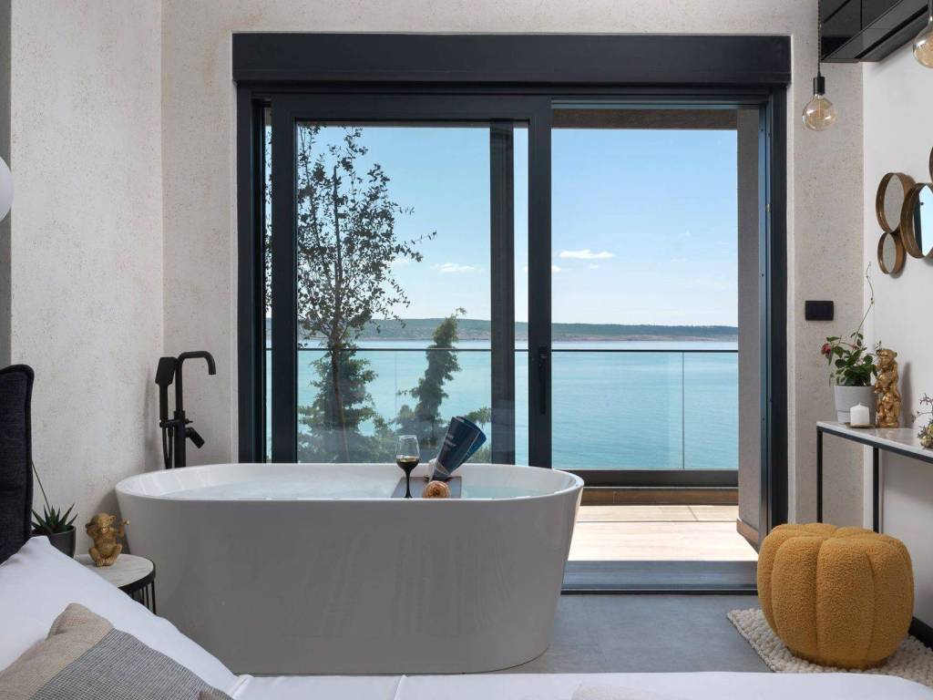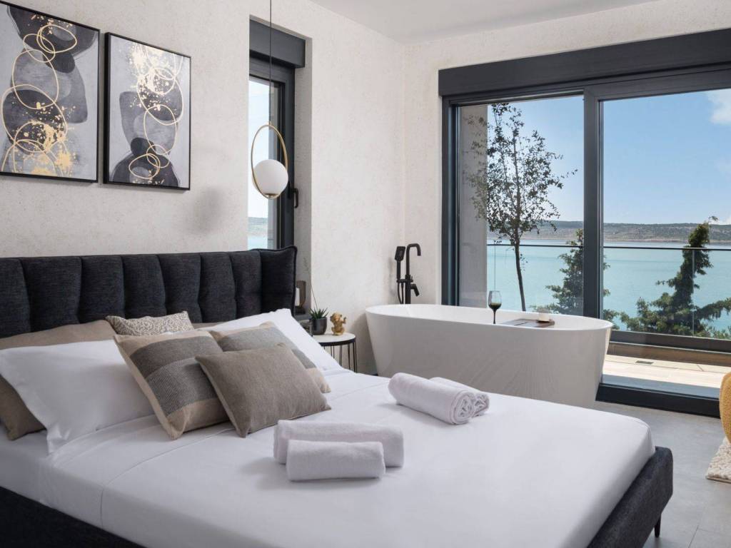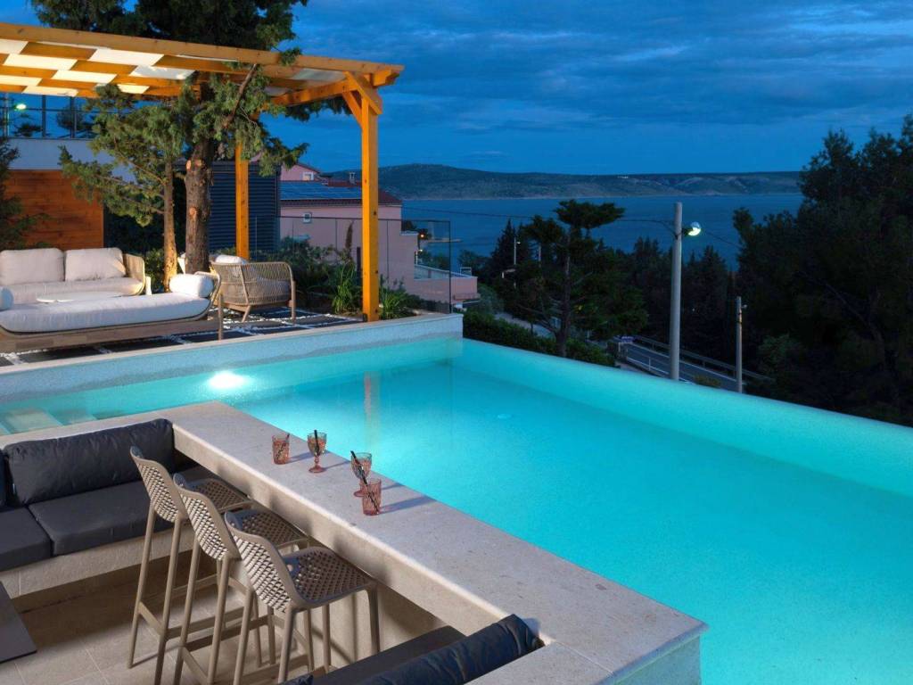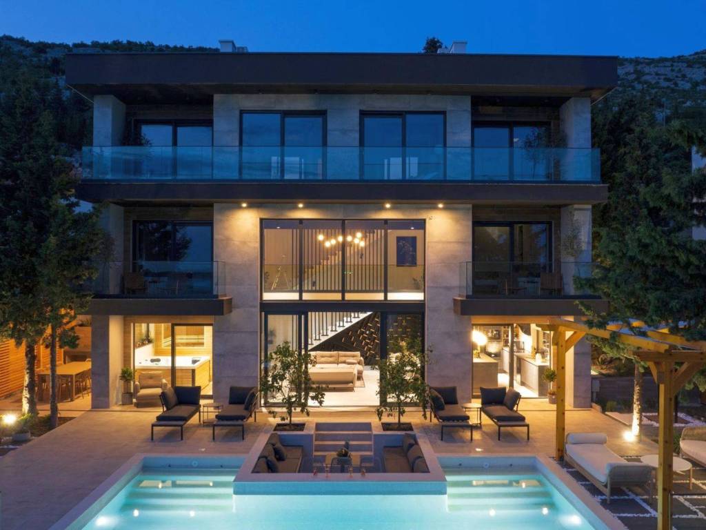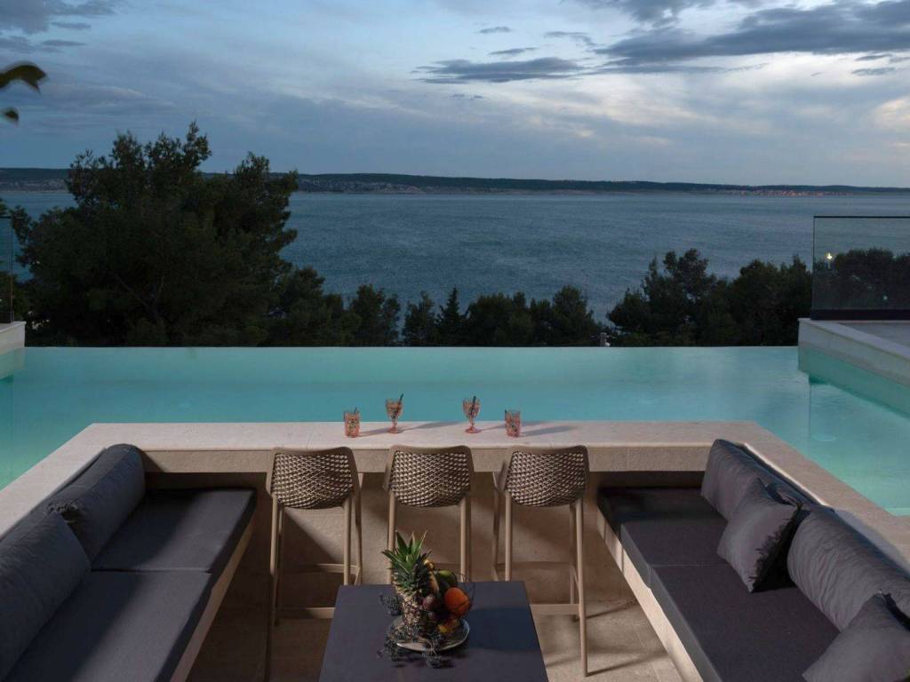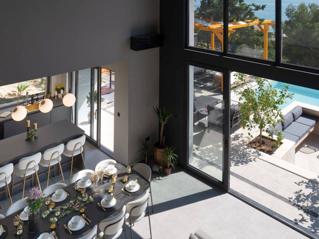 impressive sea view. On the third floor there are four bedrooms with attached bathrooms. The glass walls in the rooms allow a view of the sea from inside the room. In the landscaped garden there is a swimming pool, summer kitchen and a covered terrace with outdoor furniture.