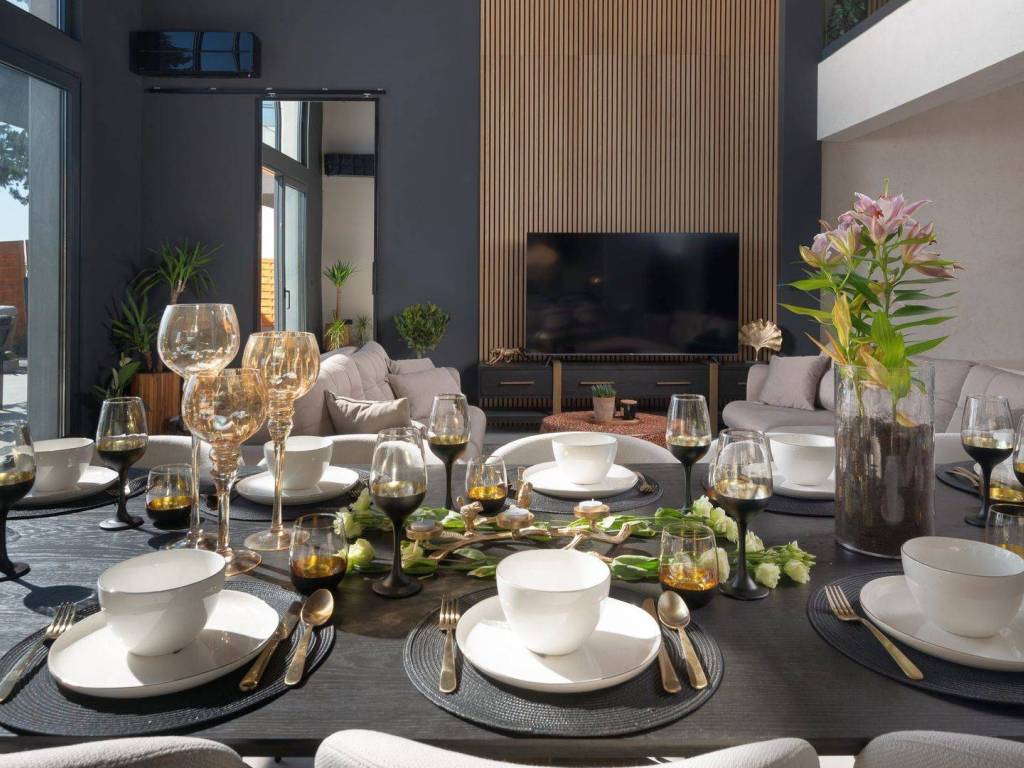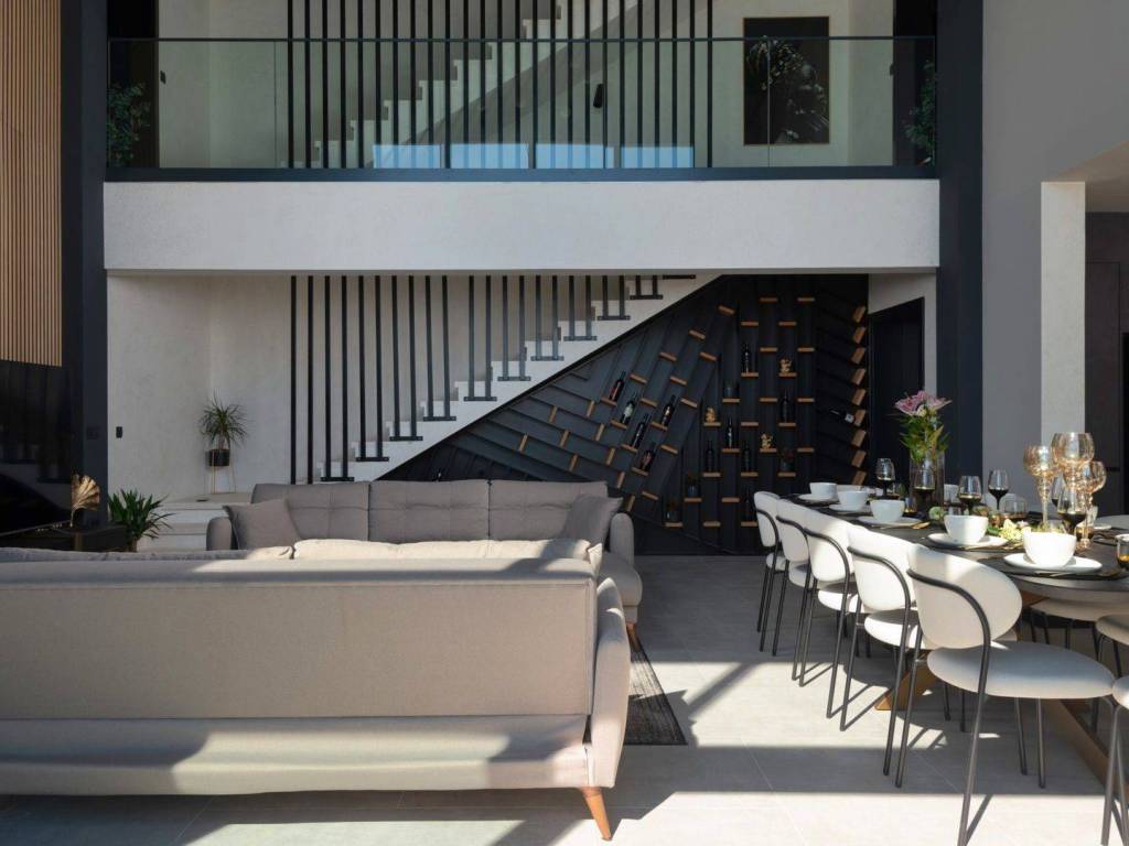 The ground floor has an open kitchen concept with dining area, living room, pantry, sauna, jacuzzi and one bathroom. An internal staircase leads to the first floor