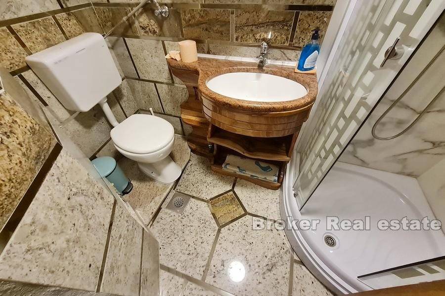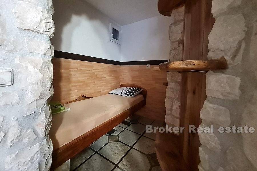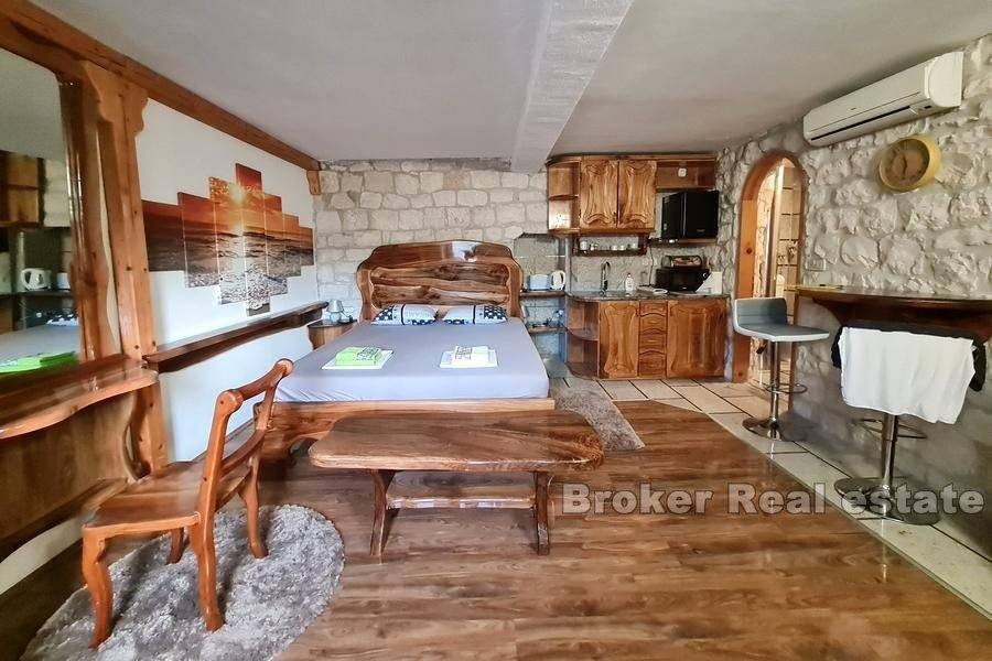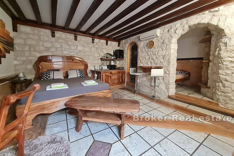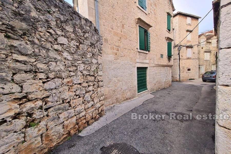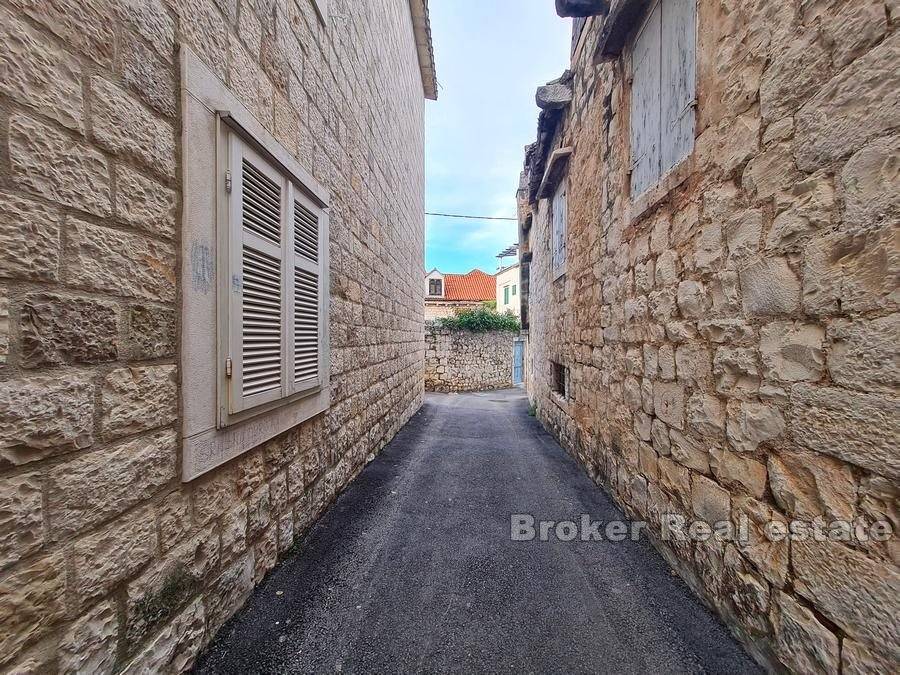 Stone house in a row with 500 years of history, with two entrances, located near the Trogir bridge on Ciovo, surrounded by decorated stone houses, in the old town.
