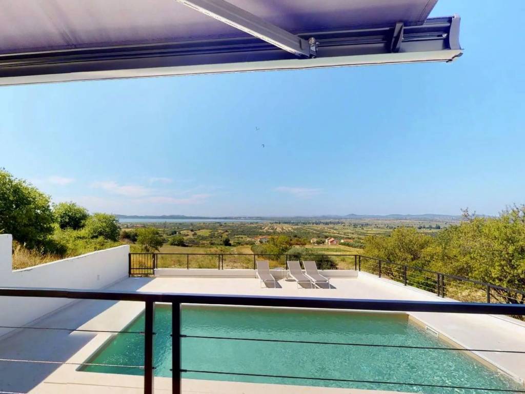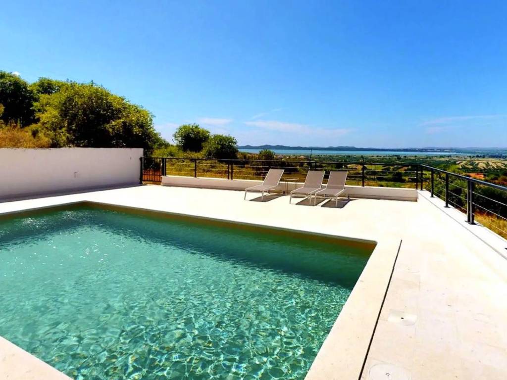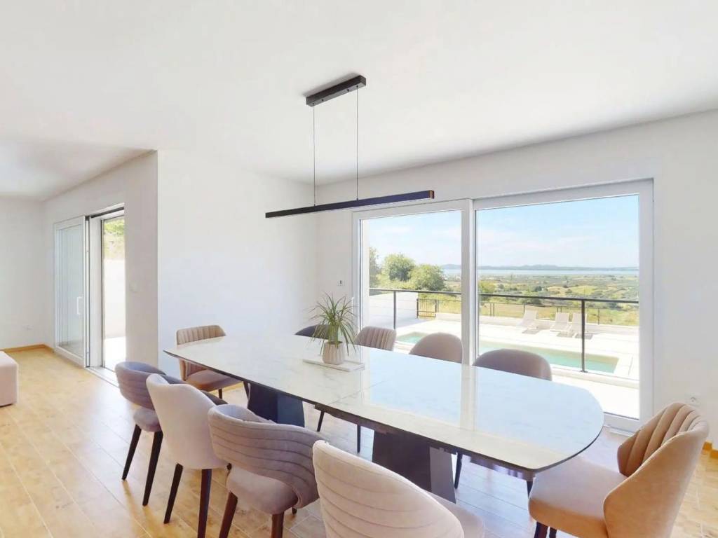 In an exceptionally attractive location in Pakoštane, one of the most beautiful places on the Zadar Riviera, this elegant, newly built villa is situated, representing a perfect blend of contemporary architecture and natural surroundings. Thanks to its elevated position, the villa offers a spectacular, unobstructed view of greenery and the enchanting Vransko Lake, creating a unique sense of privacy, peace, and luxury.