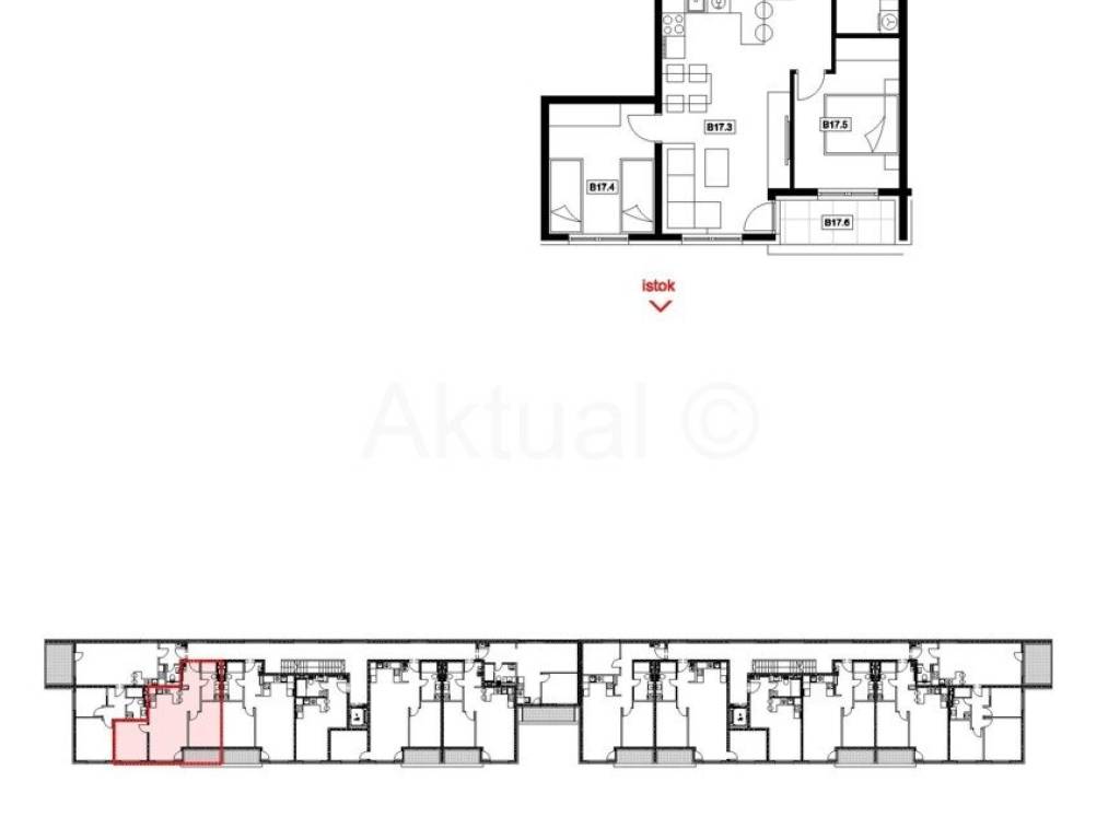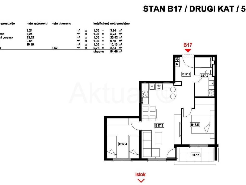 Stan oznake B17 nalazi se na II-katu zgrade, ukupne površine 54.46 m2 a sastoji se od ulaznog prostora/hodnika, kuhinje sa blagovaonicom i dnevnim boravkom,dvije sobe, kupaonice i loggie.
