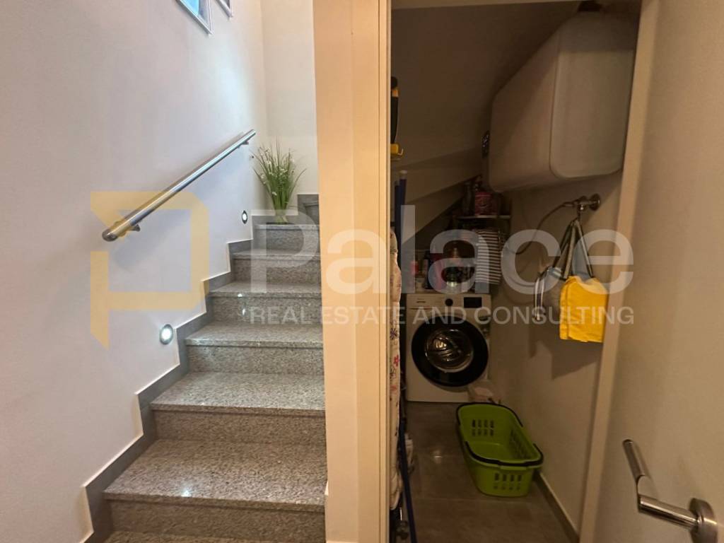 In the ground floor, there is an entrance hall with a wardrobe, a custom-made kitchen, and an open concept dining room with a living room. The central part of the living room features a large glass wall leading to a terrace, not only visually expanding the space but also serving as an abundant source of natural sunlight throughout the day. A small guest bathroom is also located in the hallway for practicality. Under the staircase, there is a convenient storage/laundry room, intelligently utilized for storing all household essentials.