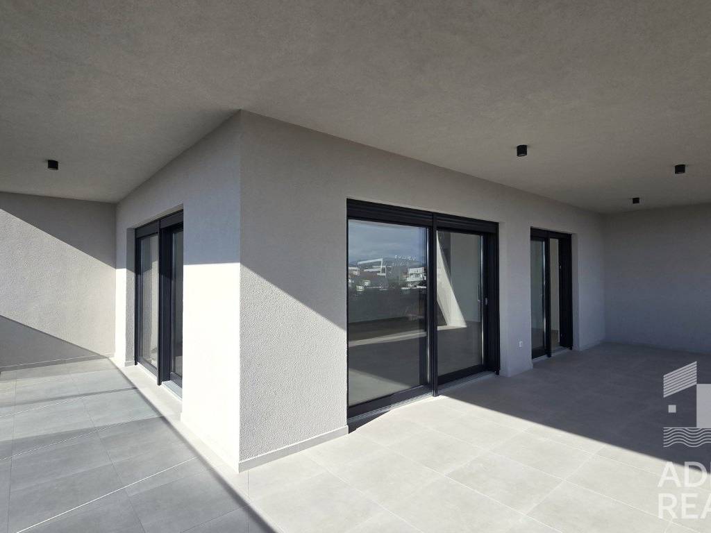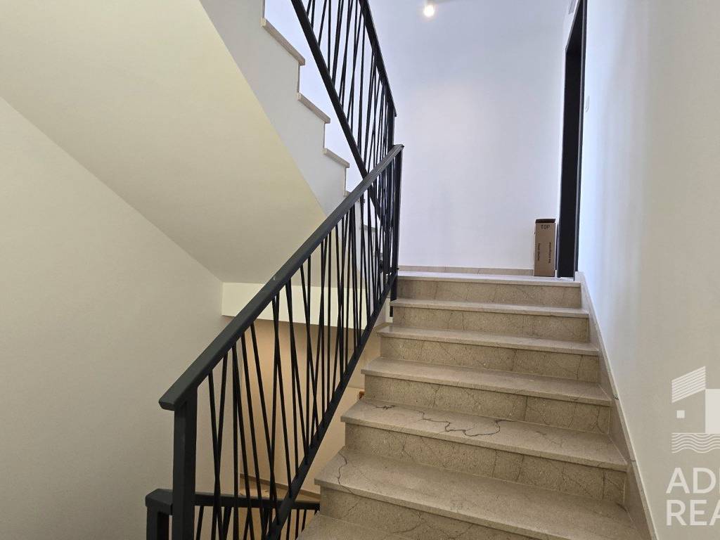 The apartment has two parking spaces and is built with high-quality equipment that includes PVC windows with mosquito nets and electric roller shutters, underfloor heating throughout, air conditioning in the living room and bedrooms, and ceramic and laminate flooring. The common staircase is covered with stone, and the terraces have elegant glass railings.