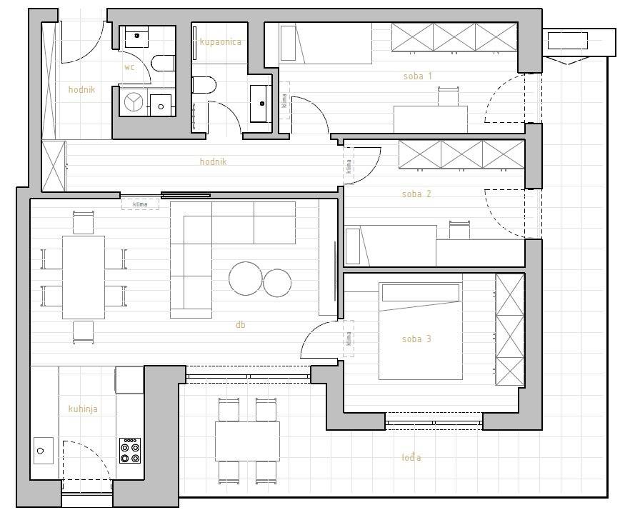 Available apartments (1.4, 2.0, 2.2, and 2.4) are all designed as spacious 3-bedroom units (3S+DB). Each residence features a large loggia, ideal for outdoor living, protected by modern sliding shutters. The building’s robust reinforced concrete structure ensures maximum safety and longevity.