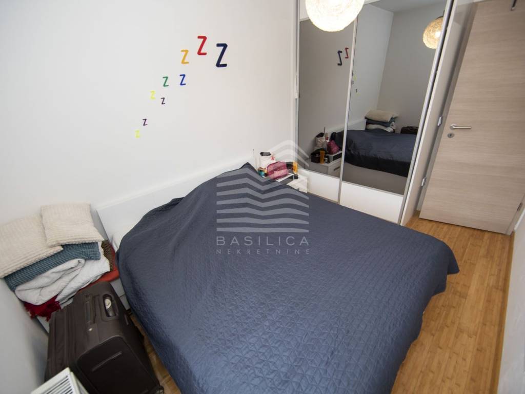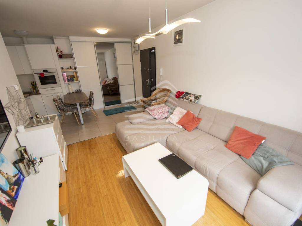 Trešnjevka, mirna ulica 3min. pješice od okretišta tramvaja i autobusa Remiza, nalazi se u zgradi građenoj 2018.g., na 2. katu zgrade (zadnji kat, nema lifta). Grijanje je centralno etažno plinsko, te je opremljen klima uređajem. Sastoji se od dnevnog boravka sa kuhinjom i blagovaonicom, spavaće sobe i kupaonice, ukupne stambene površine 36,30m2, te natkrivenog balkona od 3,4m2 (obračunski 1,7m2), spremišta u podrumu zgrade od 2,5m2 (obračunski 1,88m2), te vanjskog parkirnog mjesta od 12,25m2 (obračunski 3,06m2). Ukupna prodajna površina je 42,94m2.