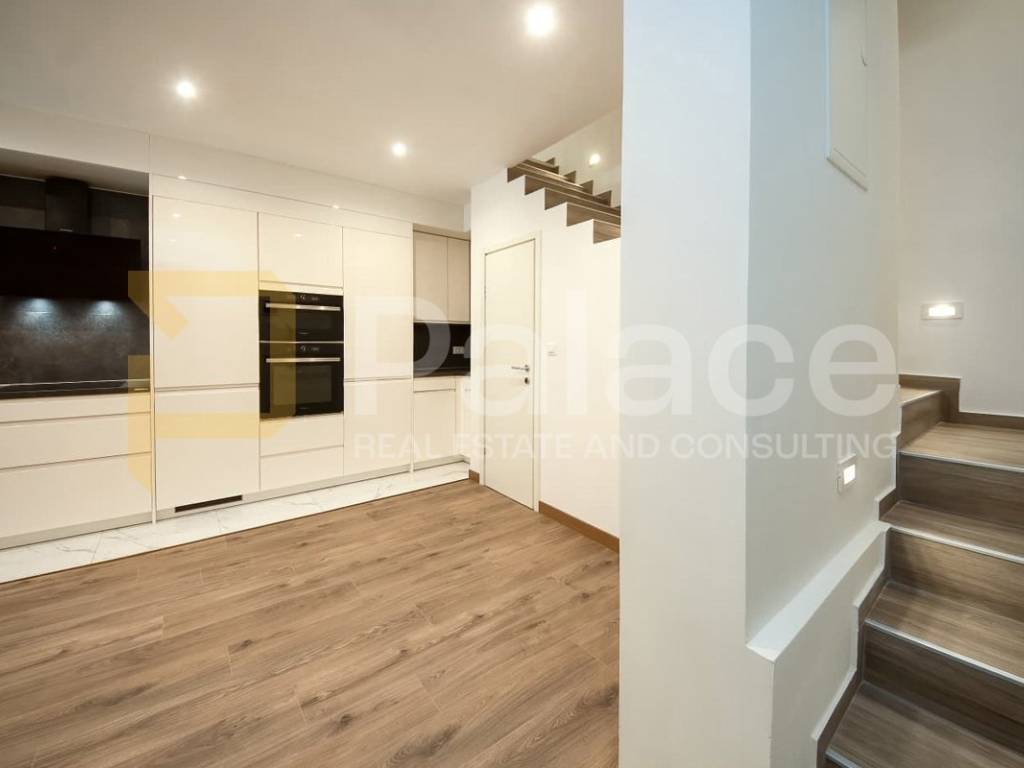 The house spans four floors and has a total area of 120 m2. The ground floor features a furnished Dankuchen kitchen, as well as a dining area. Under the stairs, there is a space used for the boiler connected to radiators on each floor, also serving as storage. The upper floors consist of a bedroom and a bathroom, with the same layout on the floor above. The top floor is designed for a living room with a large glass window and access to a beautiful terrace overlooking one of the most beautiful churches, part of the city, and the sea. The house is equipped with air conditioning.