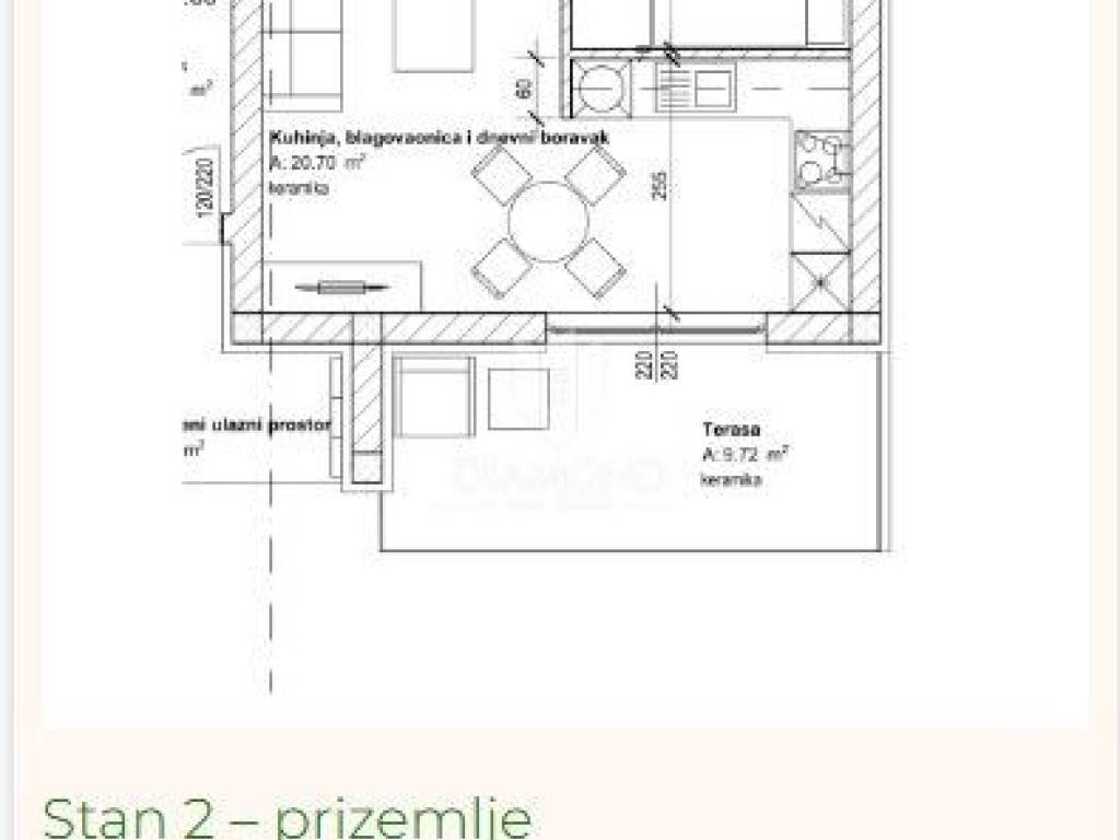The ground floor apartment with a total area of 58 sqm offers a functional layout and consists of a living room, kitchen with dining area, two bedrooms and a bathroom. The living room opens onto a beautiful terrace of almost 10 sqm, providing additional space for relaxation and socializing.