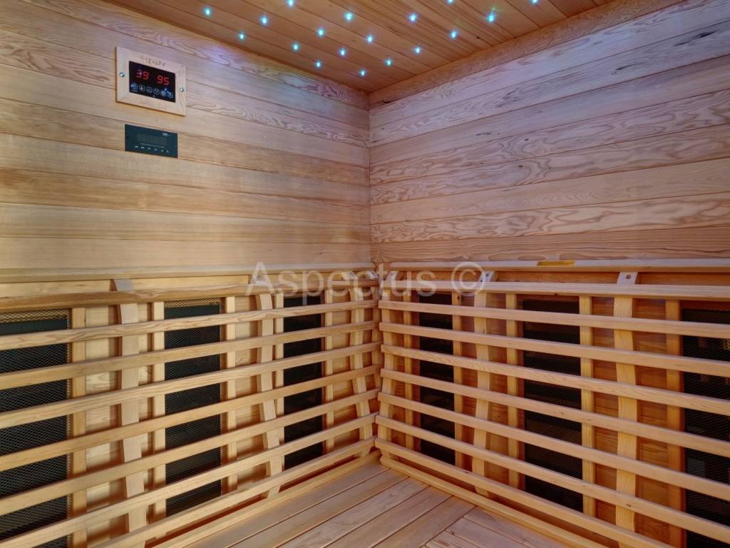 The landscaped garden includes a 32 m swimming pool, equipped with a heat pump for heating and cooling, allowing extended seasonal use. A covered outdoor kitchen with barbecue, dining table and seating area provides the perfect space for summer gatherings and relaxing evenings.