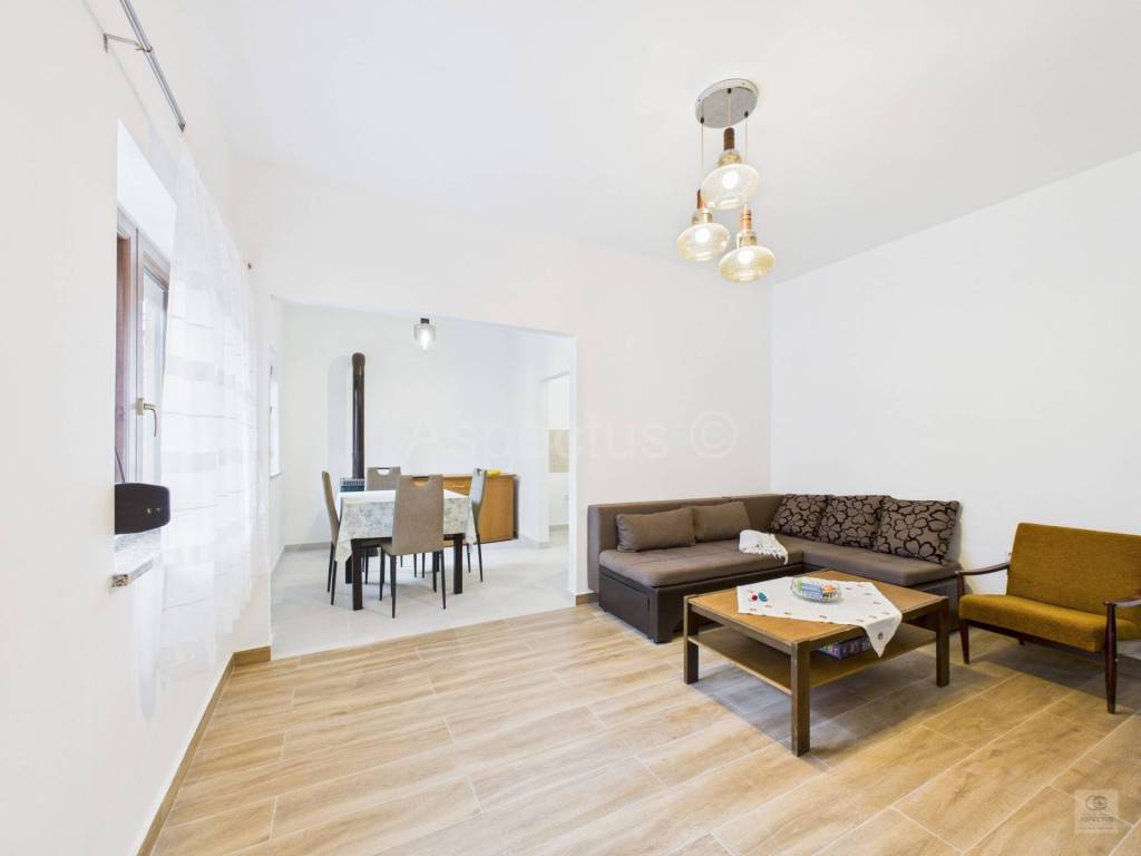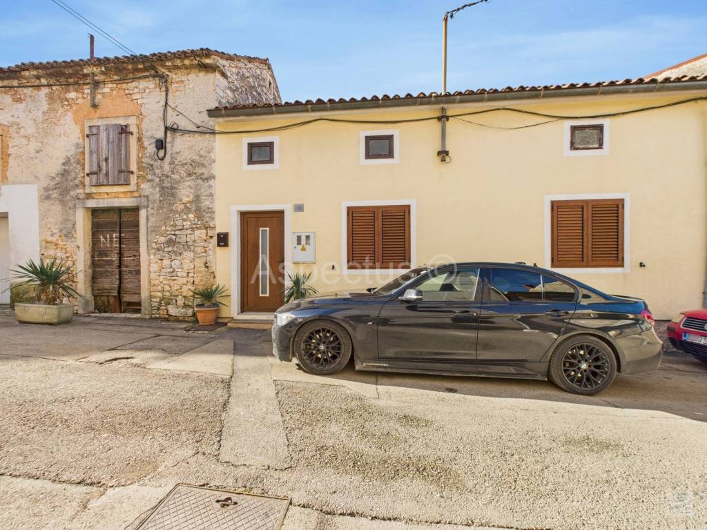 A ground-floor house is for sale in Vodnjan, Istria, located just 200 m from the town center. The house has a total area of 97 m and consists of an entrance hallway, two bedrooms, a kitchen, a dining room, a living room, a bathroom, and a courtyard measuring 57 m. From the courtyard, an external staircase leads to a large terrace and the attic of the house, where the space can be converted into an additional apartment, a creative studio, a workshop, or another multifunctional area.