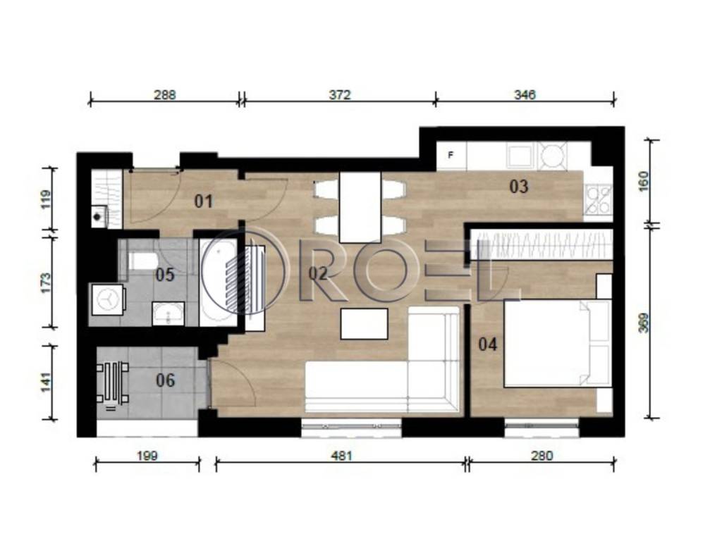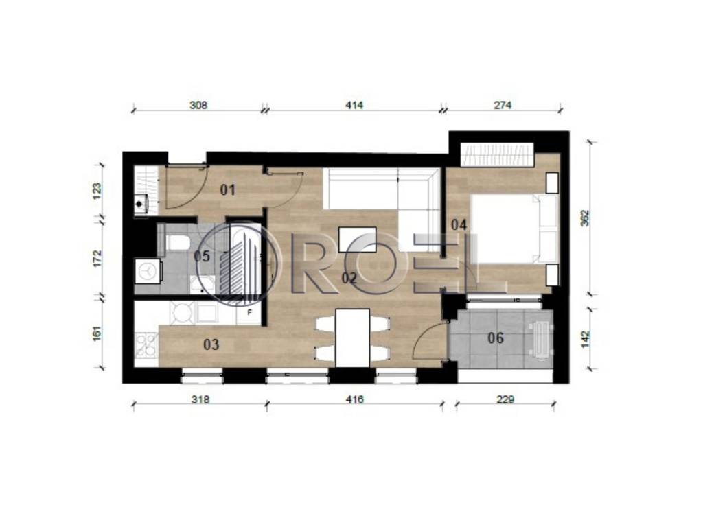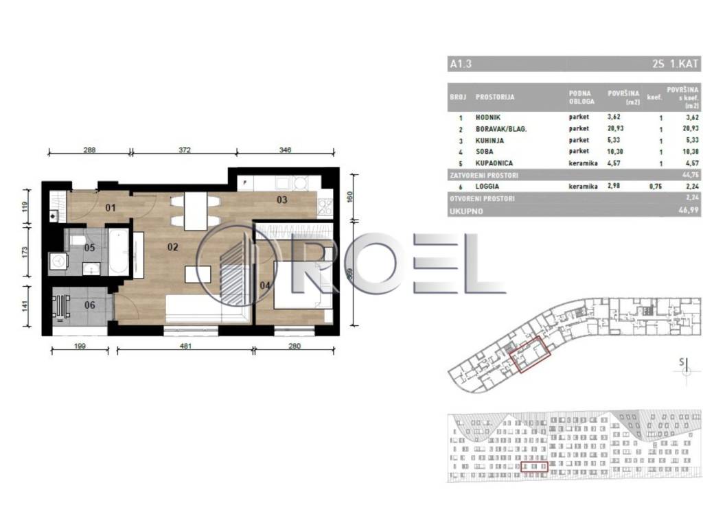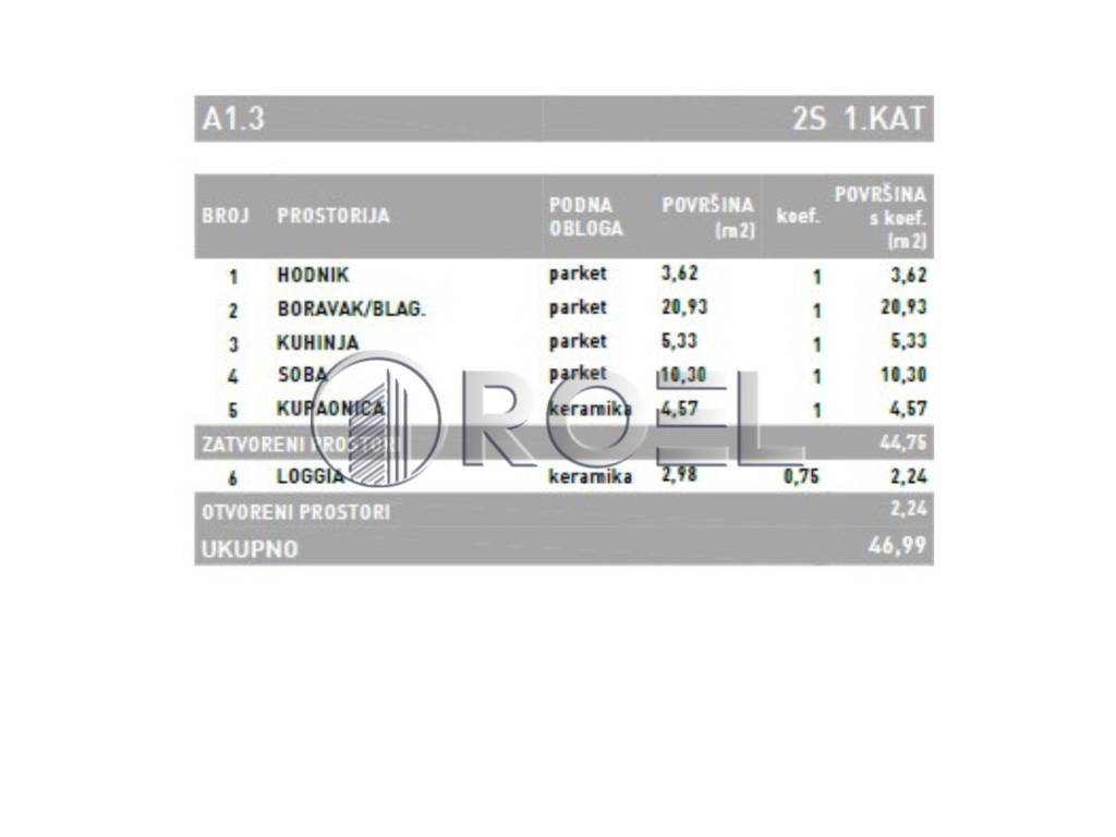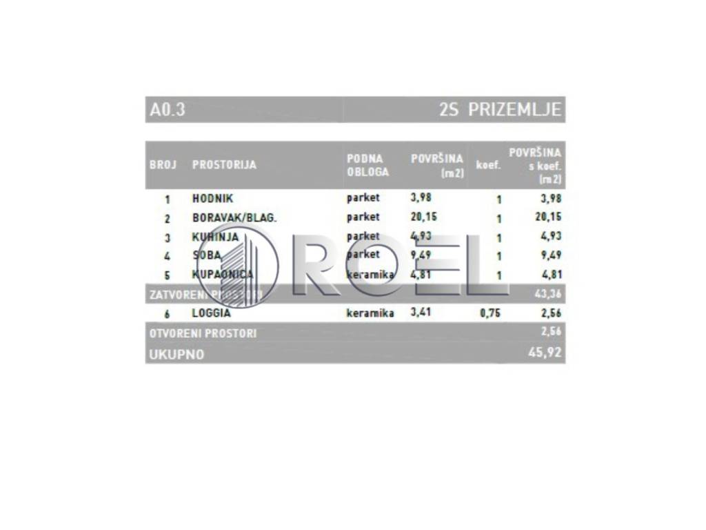 Two-bedroom apartment with a total area of 45.92 m, located in the Dubrava district of Zagreb. It is located on the first, third, fifth and sixth floors and on the ground floor of a building with a total of 6 floors. It consists of an entrance hall, living room with kitchen and dining room, one bedroom, wardrobe, bathroom with toilet and loggia. It is oriented to the southeast.