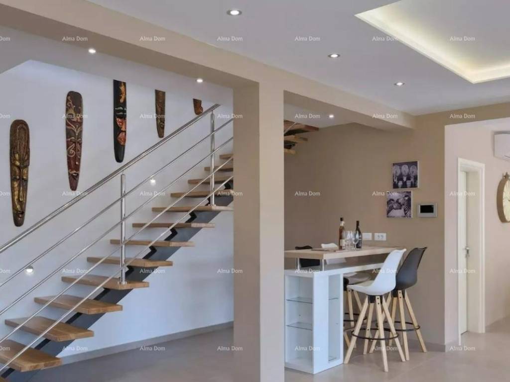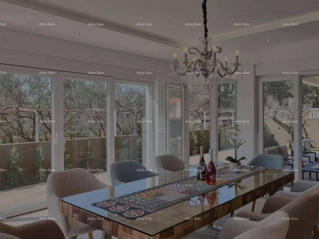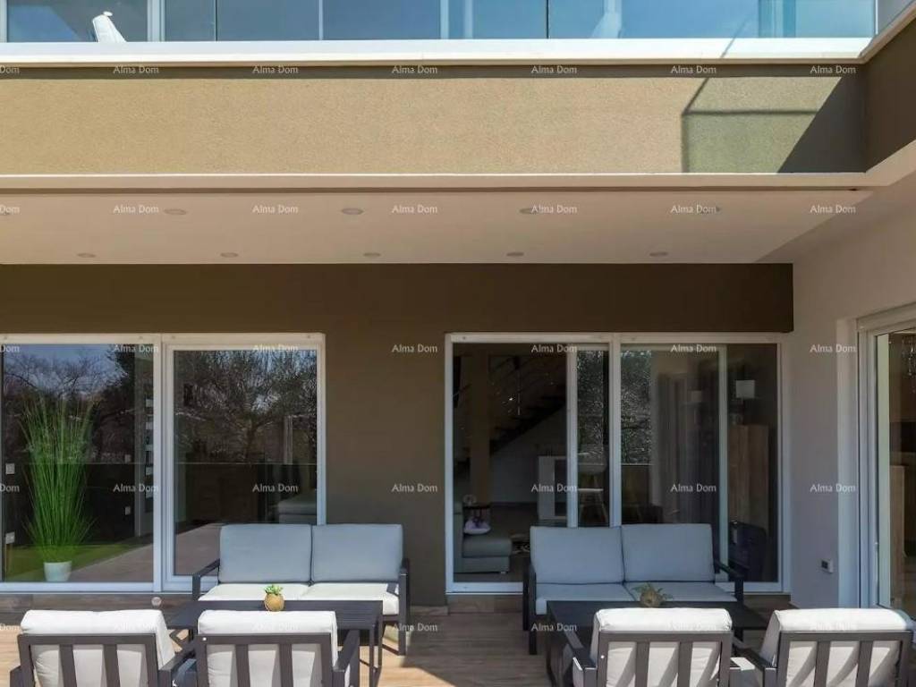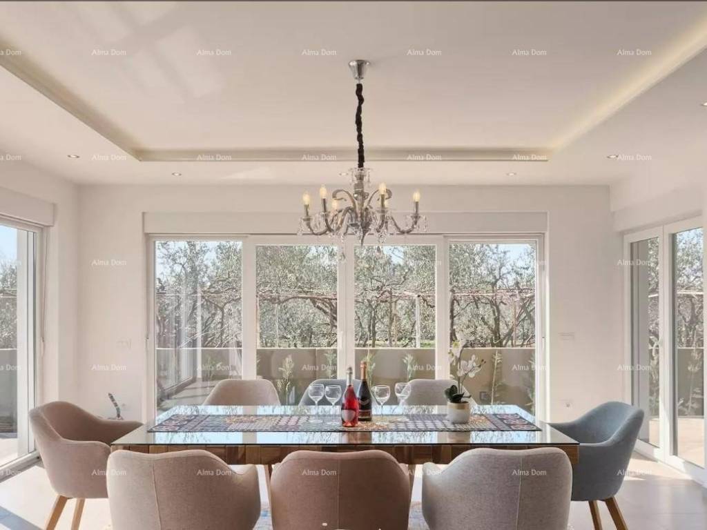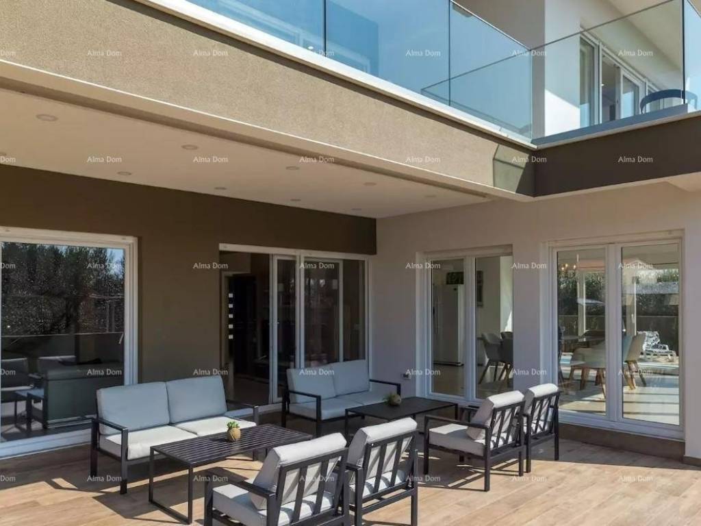 The town of Fažana is located on the southwestern coast of the Istrian peninsula, overlooking the sea and the beautiful islands of the Brijuni archipelago. It is only 8 km from Pula. Close to the ancient ruins of Pula, Fažana, and Valbandon. The property is situated in a quiet private village just 700m from the sea and only 700m from the center of Fažana and its beautiful promenade. It spans two floors, with a total living area of 300 square meters. On the ground floor, there is a spacious and beautifully decorated living room connected to a modern kitchen, dining area, and bathroom. High-quality materials, plenty of natural light, and unique chandeliers make this part of the house special and inviting. On the first floor, there are four bedrooms, each with its own bathroom and a spacious terrace offering uninterrupted views of the sea and Brijuni. A unique feature of this property is the rooftop terrace, which is home to 10 sun loungers, with breathtaking views! The 223 m plot includes a private pool, sunbathing terrace, and greenery with outdoor tables and benches. A rich area, parking for several cars. An ideal investment for a peaceful family life or as a tourist rental investment with a solid return on investment!