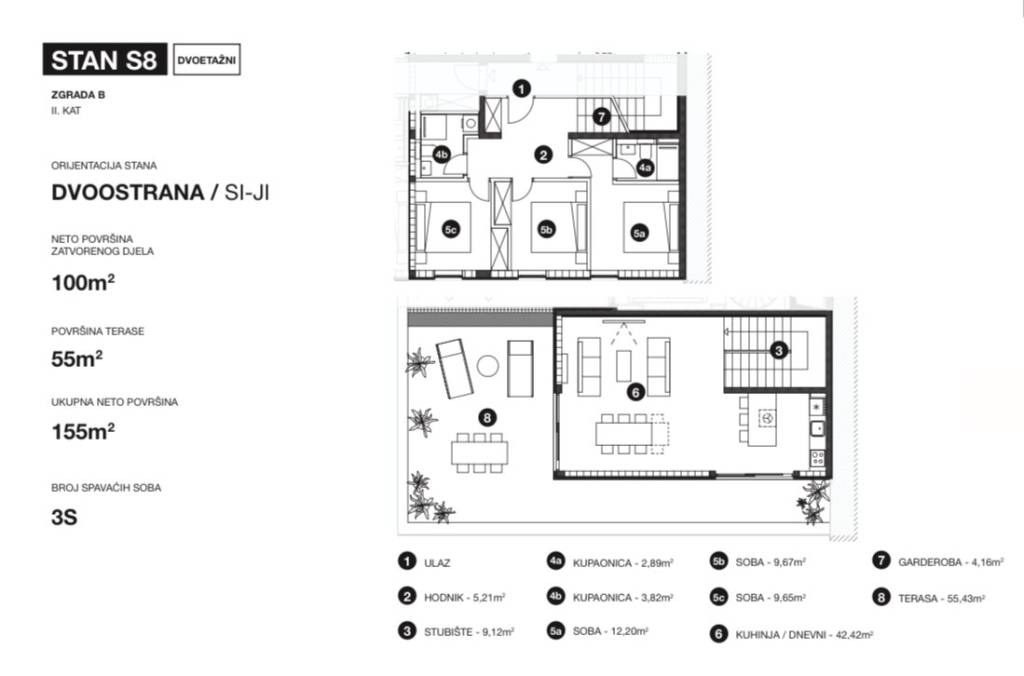 Hvar, Vrboska, trosoban stan u novogradnji smješten na drugom katu manjeg stambenog objekta.Površina zatvorenog dijela je 100 m2.Orijentacija stana je sjeveroistok - jugoistok.Podijeljen je na dvije etaže.Na prvoj etaži se nalazi hodnik, dvije kupaonice te tri spavaće sobe.Na gornjoj etaži se smjestila kuhinja s blagovaonicom, dnevni boravak i terasa površine 55.43 m2.Parkirna mjesta se odabiru i plaćaju dodatno, ovisno o vrsti, je li neotkriveno ili natkriveno.Stan prodaje tvrtka i kupac je oslobođen plaćanja 3 % poreza.Vrboska je slikovito obalno mjesto na otoku Hvaru, prepoznatljivo po autentičnoj kamenoj arhitekturi, šarmantnim mostovima i zavodljivim uvalama. Smješteno između Jelse i Starog Grada, nudi mirnu mediteransku atmosferu s lakim pristupom svim potrebnim sadržajima.Za dodatna pitanja, stojimo Vam na raspolaganju.... Više na eurovilla.hr, ID: 167114