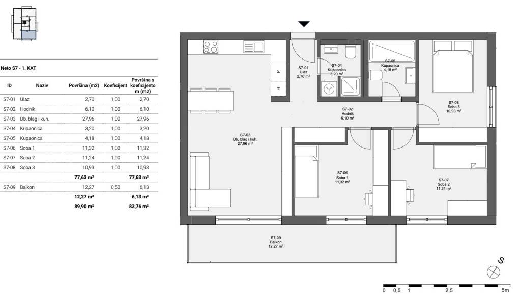 Zagreb, Sesvete, Popovec, prodaje se četverosoban stan, zatvorene površine 78 m2. Dio je vrhunskog projekta s 19 stanova na četiri etaže u zgradi s liftom te garažnim mjestima u podzemoj etaži, na vrlo dobroj i prometno povezanoj lokaciji.Projekt Popovec odlikuje odlična projektiranost po pitanju tlocrta i iskoristivosti prostora uz iznimno funkcionalna spremišta na istim etažama gdje su stanovi. Gradnja je armiranobetonska s minimalno 15 cm termoizolacije, a od opreme se ističe podno grijanje, vrhunska stolarija, keramika i parketi prve klase, klimatizacija u svakoj sobi i sl. Stanovi imaju velike terase i otvore koji im donose dovoljno svjetla te ostavljaju dodatni dojam prostranosti.Stan S7 se nalazi na prvom katu te se sastoji od dnevnog prostora s kuhinjom i blagovaonicom, tri spavaće sobe, dvije kupaonice, ulaznog dijela, hodnika i natkrivenog balkona.Uz stan je obavezna kupnja spremišta (2,94 m2) po cijeni od 4.200 € te garažnog (18.000-21.000 €) ili vanjskog parkirnog mjesta (7.000 €).Lokacija je vrlo dobra, u brzorastućem naselju sa svega 5 minuta vožnje do središta Sesveta i manje od tri minute vožnje do autoceste. Također, budući produžetak Branimirove ulice će uvelike ubrzati dolazak u centralni dio Zagreba. Škola i vrtić su udaljeni manje od 300 metara što je dobar preduvjet za obiteljski život.Za ostala pitanja stojimo Vam na raspolaganju.... Više na eurovilla.hr, ID: 180674
