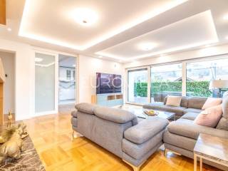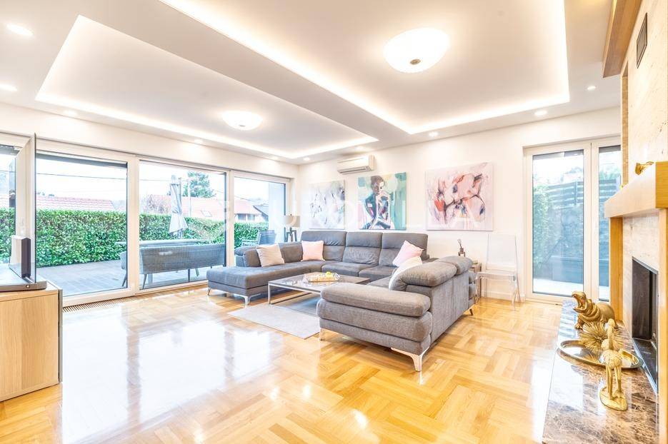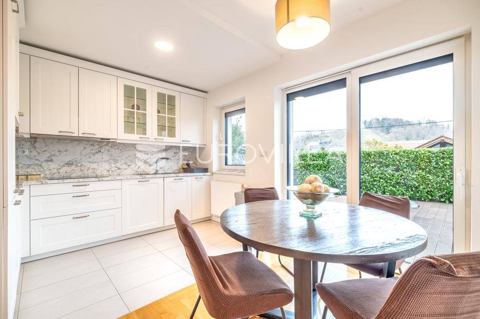 U Mlinovima, jednoj od najpoželjnijih lokacija podsljemenske zone, prodaje se ova obiteljska vila novije gradnje. Smještena je u mirnom i zelenom okruženju, a svega desetak minuta vožnje od centra grada.Razvedena je u četiri etaže povezane unutarnjim stubištem:Prizemlje: garaža za 2 automobila, vešeraj, vinski podrum, toalet, kotlovnica/strojarnica, unutarnji bazen, tuš.Visoko prizemlje: glavni ulaz, ulazni prostor/stubište, dnevni boravak, blagavaonica i kuhinja s ostavom te izlazom na terasu i vrt, toalet za goste, spavaća soba, kupaonica.1. kat: tri spavaće sobe od kojih jedna s izlazom na vrt, a druge dvije na veliku natkrivenu terasu, dvije kupaonice, manji balkon, stubište s izlazom na veliki balkon.2. kat: dvije spavaće sobe, kupaonica, dvije terase, stubište (veliki apartman).Pri opremanju korišteni su prvoklasni materijali i uređaji. Grijanje je etažno plinsko. Kupaonice s oblogama od kamena, kuća obložena kamenom travertinom, klimatizirana, ALU stolarija s troslojnim staklima, komarnici, električne vanjske žaluzine, videonadzor, alarmni sustav itd.Nalazi se na dominantnoj poziciji s prekrasnim pogledom na Medvednicu i na istočnu stranu, svega nekoliko minuta od Spara, pizzerie, caffe bara, restorana Okrugljak. U neposrednoj blizini javnog gradskog prijevoza (autobus).Ostale informacije na upit.... Više na eurovilla.hr, ID: 251862