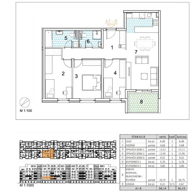Četverosoban stan površine 86,59 m2 smješten na 1. katu.Stan A1-8 sastoji se od ulaza, hodnika, 3 spavaće sobe, 2 kupaonice, dnevnog boravka, kuhinje s blagovaonicom te loggije.Velika Gorica, projekt stambene novogradnje namijenjen stalnom stanovanju, koji obuhvaća 91 stambenu jedinicu. U sklopu zgrade osigurano je ukupno 182 garažnih i parkirnih mjesta, od čega je 28 garažnih mjesta smješteno u prizemlju, 97 garažnih i parkirnih mjesta u podzemnoj etaži te dodatnih 57 parkirnih mjesta na razini terena.Uz kupnju stana obavezna je kupnja garažnog mjesta na -1 etaži po cijeni od 25.000,00 EUR ili garažnog mjesta na 0 etaži po cijeni od 30.000,00 EUR zajedno s parkirnim garažnim mjestom po cijeni od 18.000,00 EUR ili vanjskim parkirnim mjestom po cijeni od 10.000,00 EUR. Dakle, garažno mjesto na -1 etaži ili garažno mjesto na 0 etaži + garažno parkirno mjesto ili vanjsko parkirno mjesto.Građevina je projektirana kao armiranobetonska konstrukcija, međusobno povezana zidovima i gredama, s punim armiranobetonskim stropnim pločama i ravnim krovom. Vertikalni konstruktivni sustav čine armiranobetonski zidovi debljine 20 cm izvedeni kroz sve etaže, dok horizontalni sustav čine armiranobetonske ploče debljine 20 cm.Pročelje je predviđeno s toplinskom izolacijom debljine 15 cm u ETICS sustavu, izvedenom od EPS-a, a u zonama požarnih prekida, u kontaktu sa stubištem i na podgledu prizemlja od mineralne vune iste debljine. Završna obrada izvodi se armiranom mrežicom, gletanjem i završnim slojem u boji i teksturi prema projektu. Vanjska stolarija predviđena je kao PVC, u tonu definiranom projektom.Krov je projektiran kao ravni neprohodni krov, a svi slojevi izvedeni su u skladu s projektom fizike zgrade. Unutarnji pregradni zidovi izvode se kao gipskartonski, debljine 10 do 20 cm, ovisno o namjeni prostora, uz primjenu potrebne zvučne izolacije gdje je to predviđeno. Zidne površine su završno obrađene soboslikarskim radovima u boji prema projektu.Podovi u stanovima izvode se kao plivajući sustav s toplinskom izolacijom od polistirena i cementnim estrihom. Završne podne obloge predviđene su prema namjeni prostora: keramika u sanitarijama, kuhinjama i na vanjskim površinama, a troslojni hrastov parket u dnevnim boravcima, blagovaonicama, ulaznim prostorima i spavaćim sobama. U ponudi su tri varijante keramičkih pločica.Grijanje je riješeno plinskim etažnim podnim sustavom. Stanovi su opremljeni klima uređajima marke Bosch, PVC stolarijom s električnim roletama, troslojnim hrastovim parketom te sobnim vratima proizvođača RV Križevci. Ulazna vrata u stanove su protuprovalna, proizvođača Kolnoa sa sustavom zaključavanja Multilock.Useljenje 05/27Za sva pitanja Vam stojimo na raspolaganju.... Više na eurovilla.hr, ID: 416214