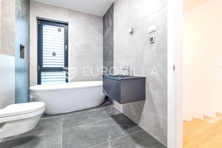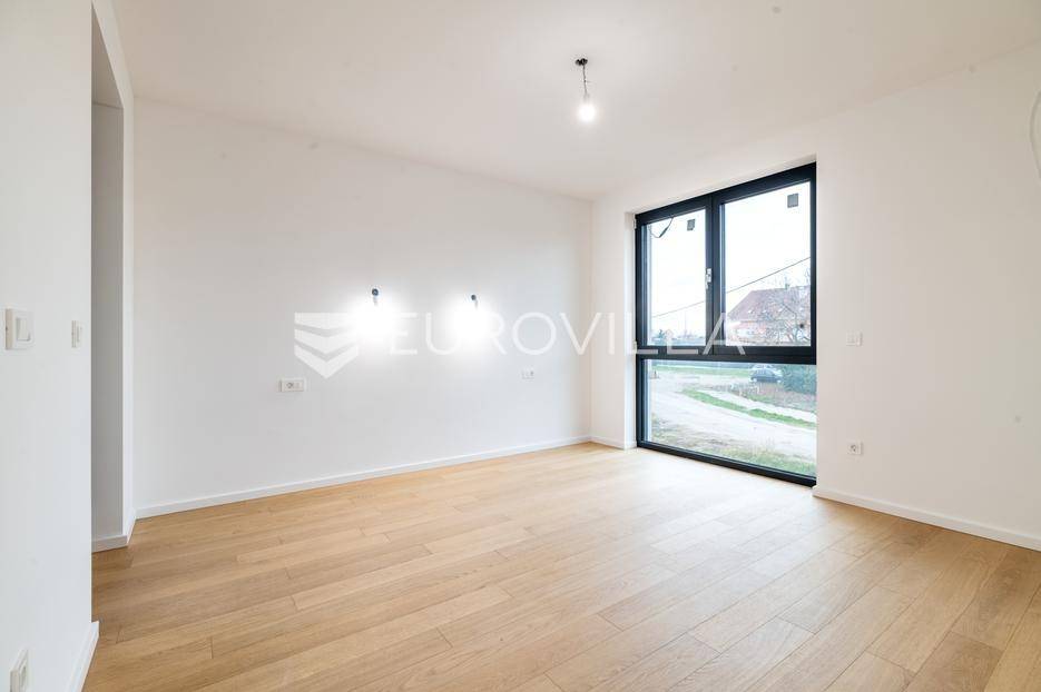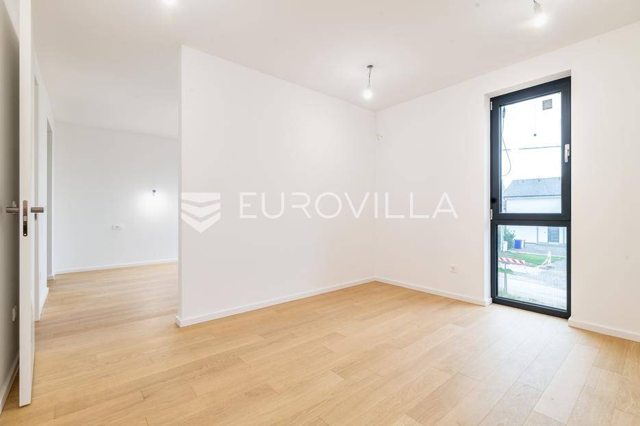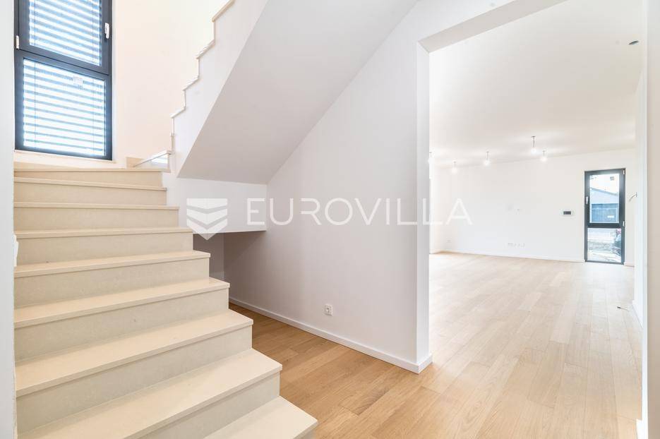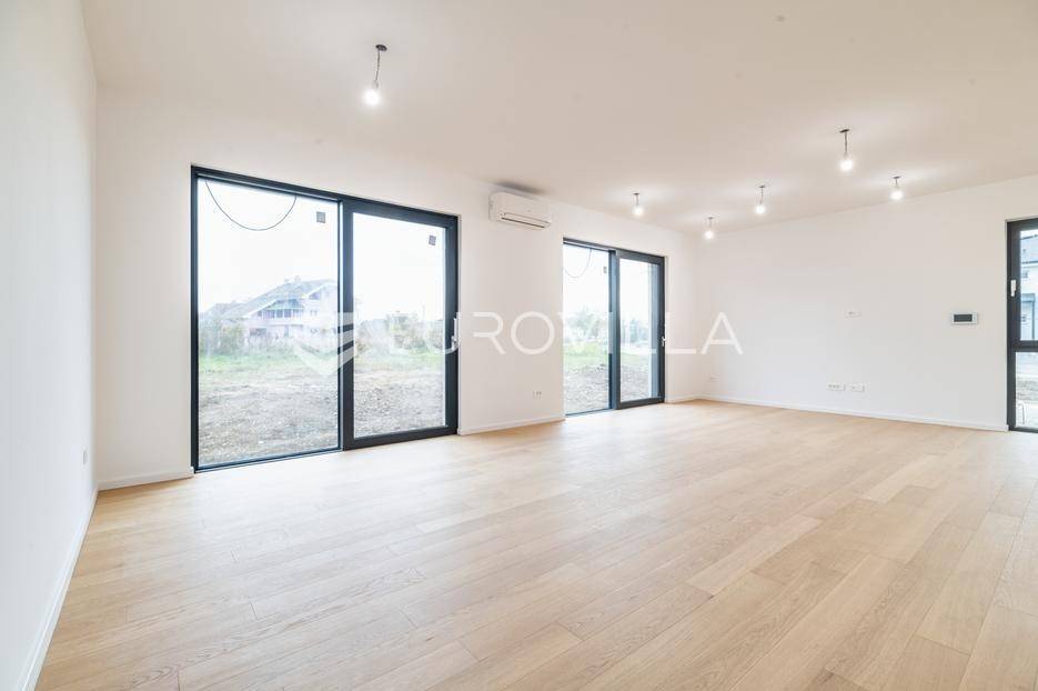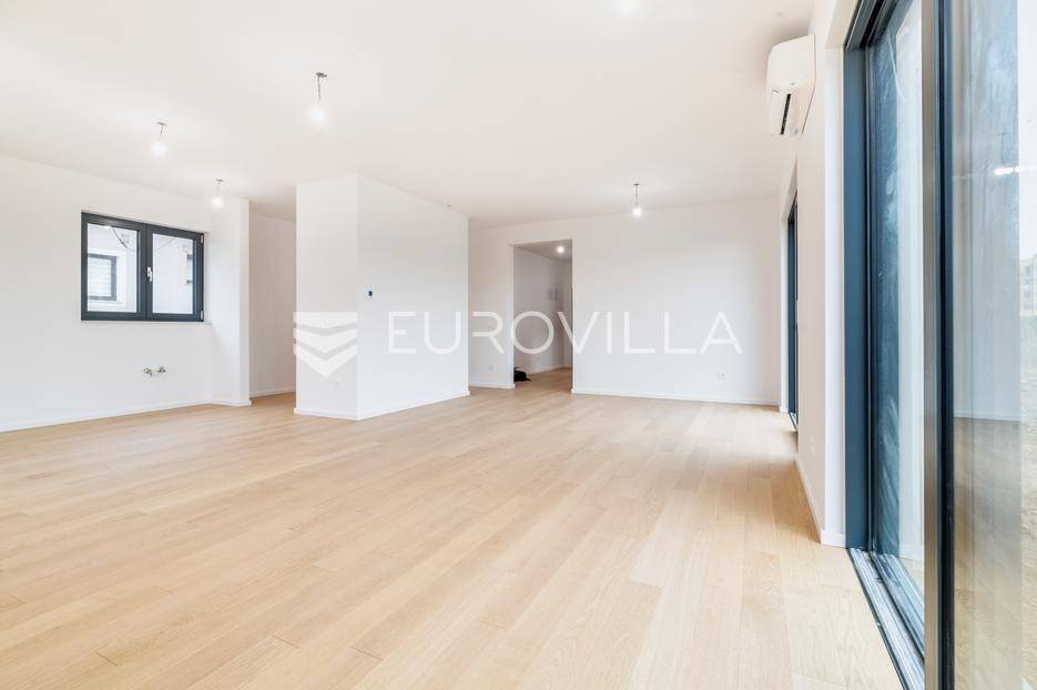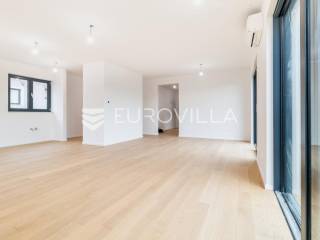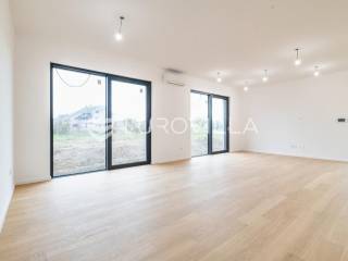 Velika Gorica, Kurilovec - moderan četverosobni stan neto korisne površine 170 m² u prizemlju urbane vile s vrtom i dva parkirna mjesta.Stan se prostire na dvije etaže povezane unutarnjim stubištem. Na donjoj etaži nalazi se prostran dnevni boravak s blagovaonicom i kuhinjom te kupaonica s WC-om, dok se na gornjoj etaži nalaze kupaonica i tri spavaće sobe - uključujući glavnu spavaću sobu s vlastitom garderobom. Stanu pripada vrt površine 200 m² (20 m²), dva vanjska parkirna mjesta ukupne površine 25 m² (2,5 m²) i spremište površine 8,68 m².Nekretnina je građena visokokvalitetnim materijalima te odlikovana vrhunskim standardima energetske učinkovitosti i udobnosti:fasada s kamenom vunom debljine 20 cmkrovna izolacija (XPS 20) s termo i hidro zaštitomaluminijska stolarija s troslojnim staklimaprotuprovalna ulazna vratapodne obloge - keramika i parket I. klasesanitarije vrhunske kvalitetegrijanje putem dizalice topline s podnim grijanjem kroz cijeli stanhlađenje putem klima uređajaZgrada se nalazi na izvrsnoj lokaciji u mirnom dijelu Kurilovca, u blizini svih sadržaja potrebnih za ugodan život.Brza prometna povezanost omogućuje jednostavan i kratak pristup Zagrebu, obilaznici, autocesti i zračnoj luci, što ovu lokaciju čini izuzetno praktičnom za svakodnevni život.Ostale informacije dostupne su na upit.... Više na eurovilla.hr, ID: 644051